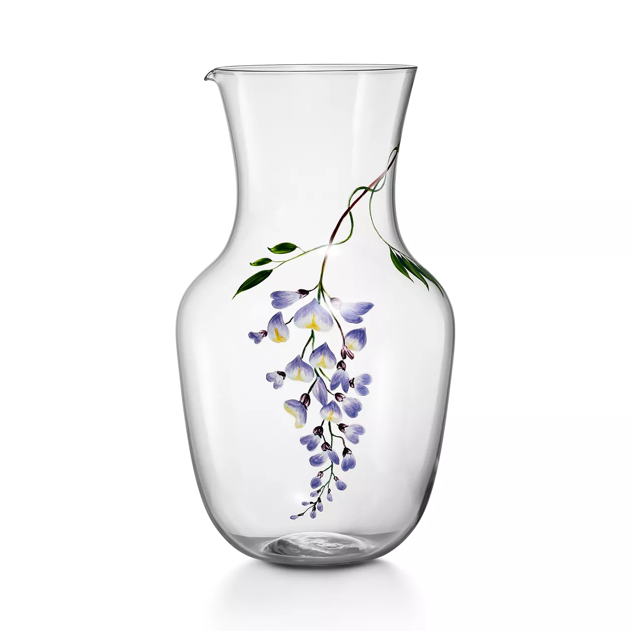 Die Tiffany Wisteria Kollektion greift von der Wisteria inspirierte Meisterwerke aus den Tiffany Archiven auf. Die handgemalten Blumen, die dieses Motiv neu interpretieren, verleihen jedem Design ein Gefühl von zeitloser, femininer Eleganz. Dieser Krug aus mundgeblasenem Glas ist mit kaskadenförmig angeordneten Wisterias verziert und wertet jeden gedeckten Tisch auf.