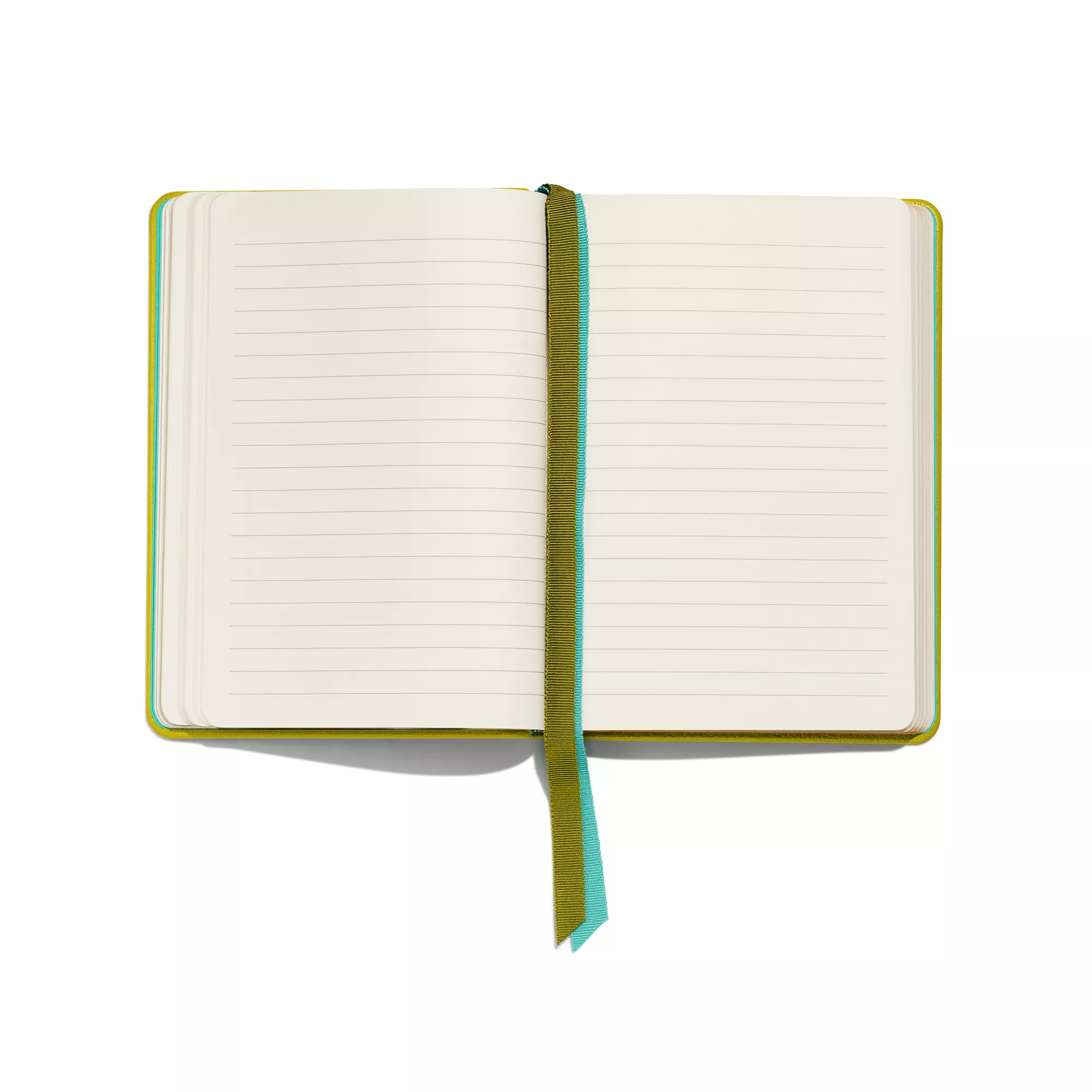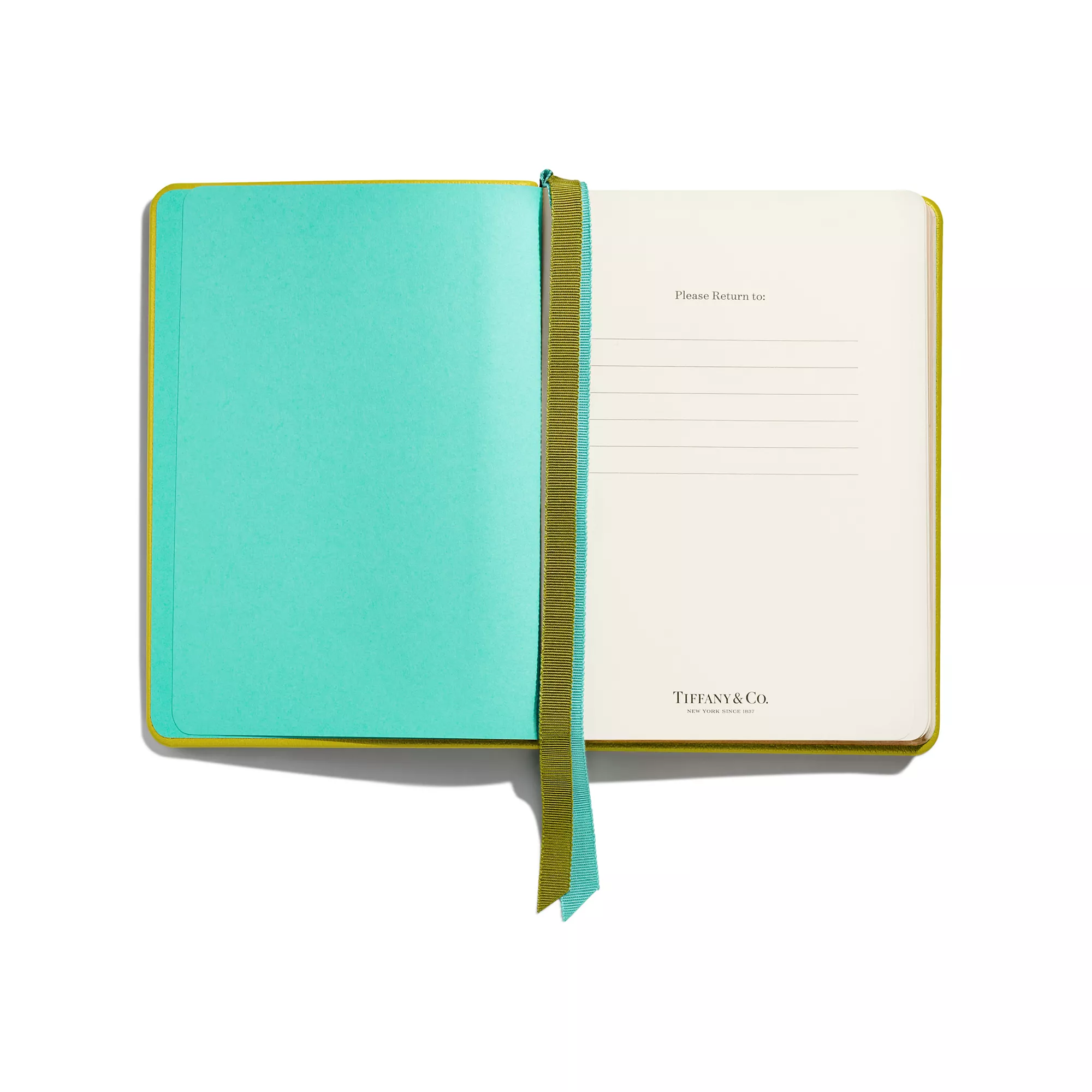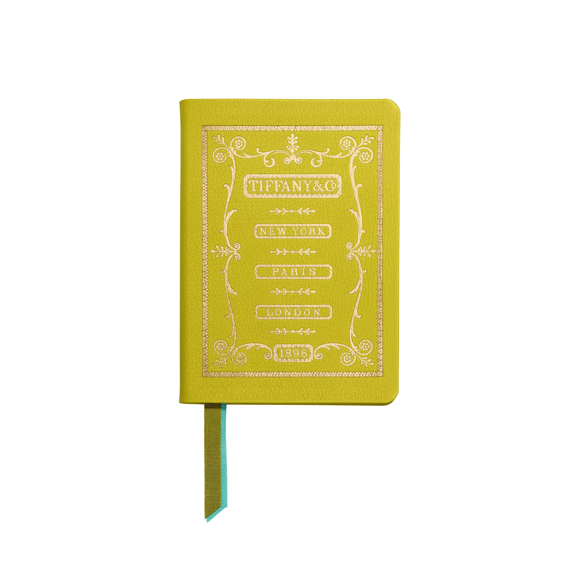 Dieses Notizbuch ist in zitringelbem Leder gebunden und wurde durch die Blue-Book-Einbände des Hauses der 1890er-Jahre inspiriert. Es beeindruckt mit vergoldeten Seitenrändern, metallischer Folierung, Akzenten in Tiffany Blue® und Ripsbändern als Lesezeichen. Notizen können auf unlinierten wie auch linierten Seiten verfasst werden.