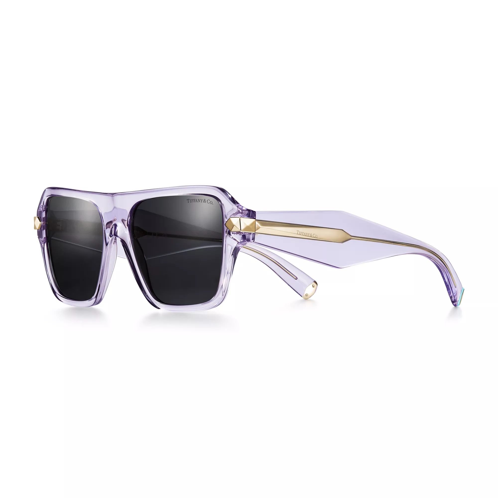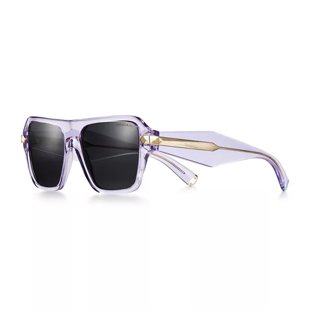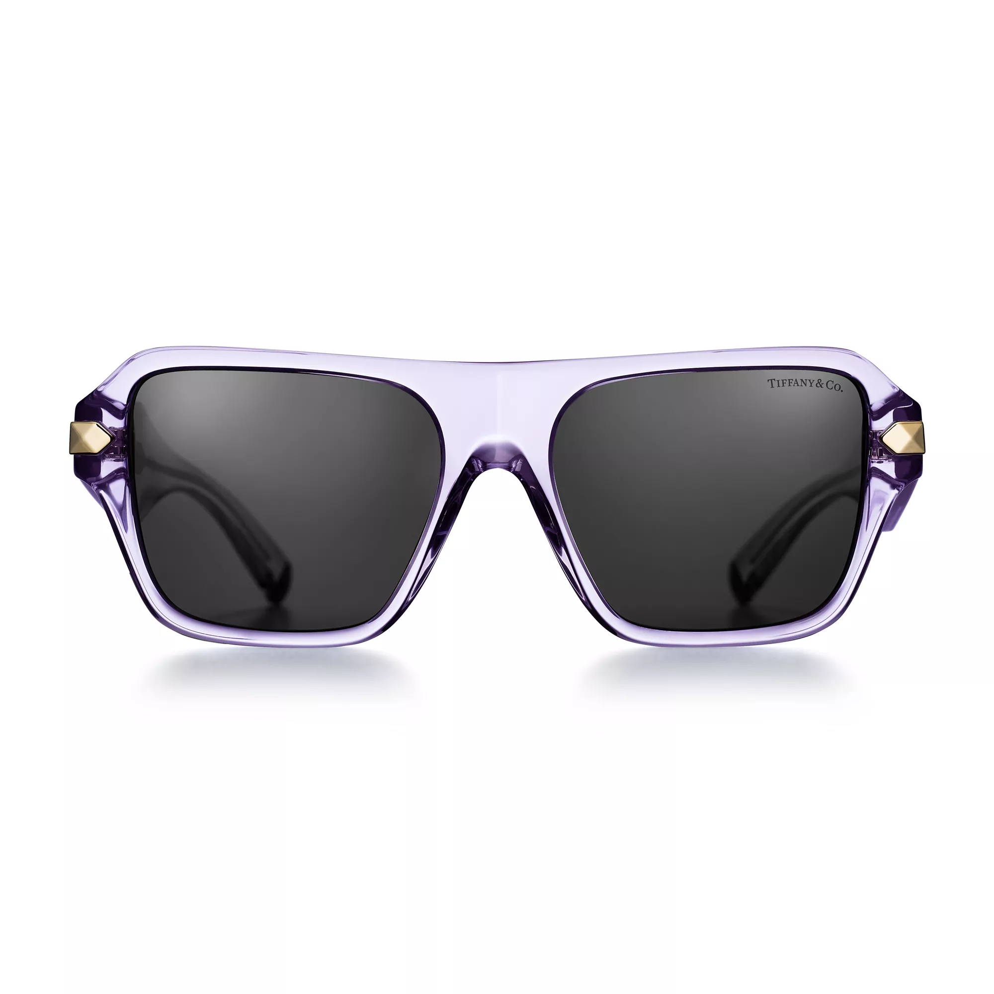 Diese Tiffany & Co. Sonnenbrille verfügt über elegante, facettierte Gläser in Formen und Farben, die von unseren legendären Edelsteinen inspiriert sind. Dieses ebenso moderne wie elegante Modell ist mit quadratischen Gläsern in Dunkelgrau und aus violettem Acetat gefertigt.