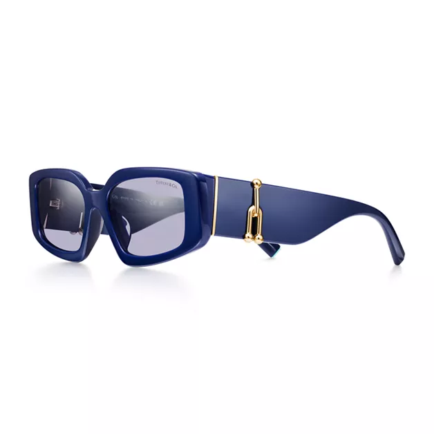Die Tiffany HardWear Kollektion ist inspiriert vom Lebensgefühl und der Energie New Yorks. Auf der Basis der Design-Codes, die die Schmuckkollektion prägen, setzt diese Sonnenbrille mit dem charakteristischen Verbindungsglied einen markanten Akzent. Die grafischen und außergewöhnlichen Fassungen sind meisterhaft aus dunkelblauem Acetat mit verspiegelten violetten Gläsern gefertigt.