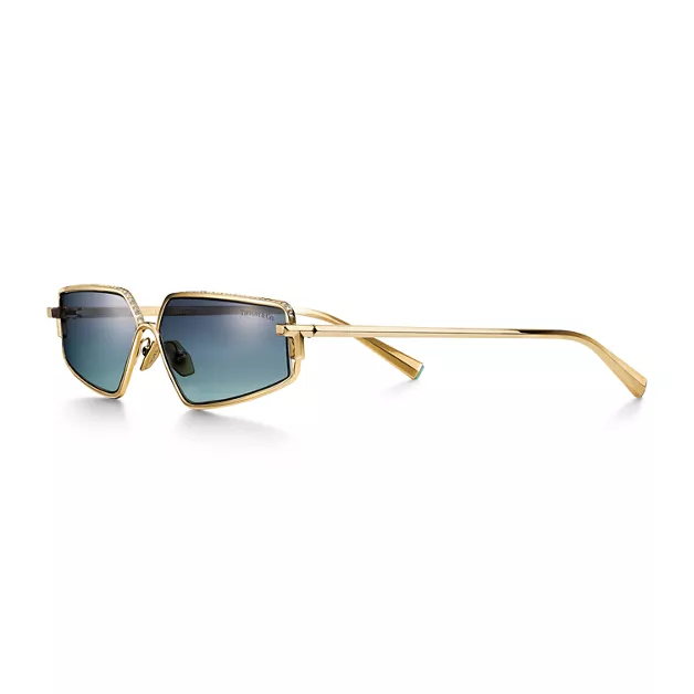 Die ikonische Form des Hauses Tiffany kehrt zurück. Tiffany T Sonnenbrillen bestechen mit einem markanten Bügeldesign, das von unserem Lieblingsbuchstaben inspiriert ist. Diese Sonnenbrille ist aus vergoldetem Metall mit von Hand gesetzten Kristallen und unregelmäßig geformten Gläsern mit azur-grauem Farbverlauf gefertigt. Setzen Sie mit dieser eleganten Sonnenbrille ein extravagantes Statement.