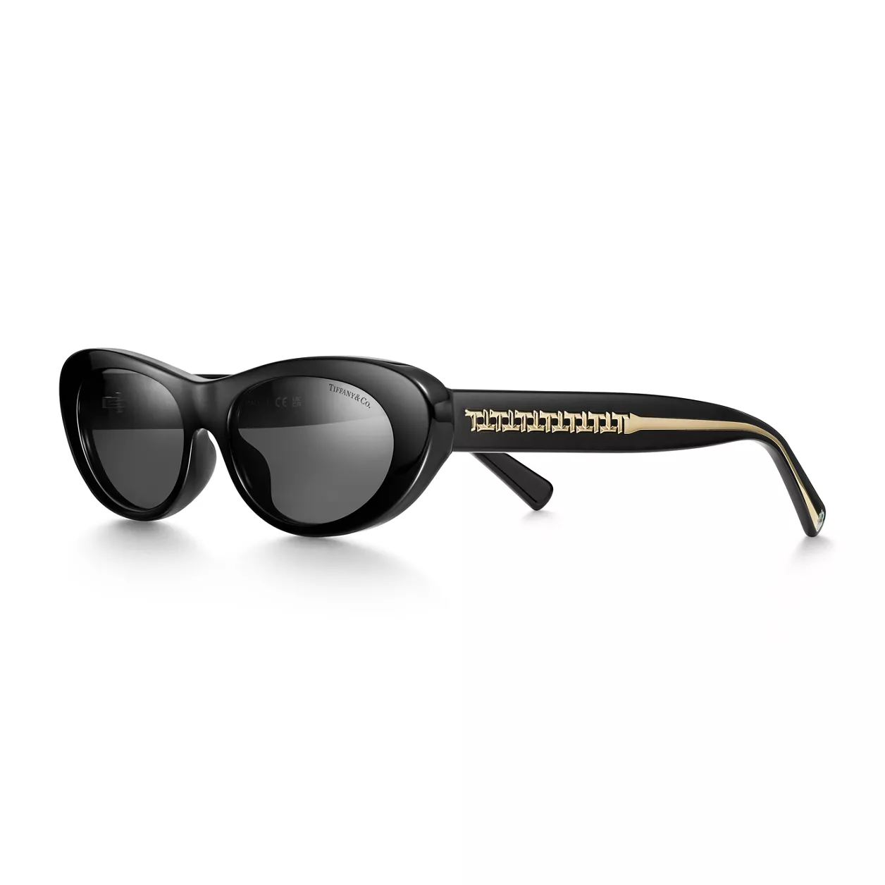 Die ikonische Form des Hauses Tiffany kehrt zurück. Tiffany T Sonnenbrillen bestechen mit einem markanten Bügeldesign, das von unserem Lieblingsbuchstaben inspiriert ist. Diese Sonnenbrille ist aus schwarzem Acetat mit blassgoldfarbenen Metallakzenten und ovalen, dunkelgrauen Gläsern gefertigt. Setzen Sie mit dieser eleganten Sonnenbrille ein extravagantes Statement.