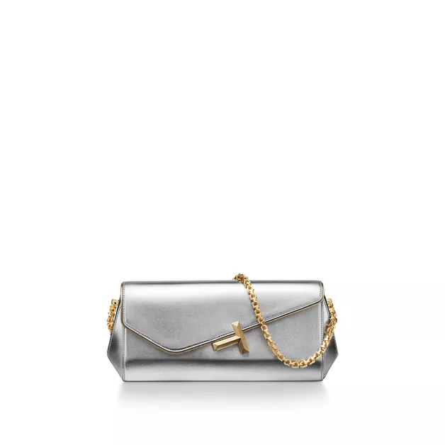 Inspirierend, bestärkend und vor allem langfristig erinnert die Tiffany T Kollektion uns an die Verbindungen, die wir fühlen, aber nicht immer sehen können. Diese Tiffany T Clutch ist aus Lammleder gefertigt und mit vergoldetem Messing versehen. Sie verfügt über ein Einschubfach, ein kleines Spiegelfach, eine T Square Kette und ein Tiffany T Logo auf der Vorderseite.