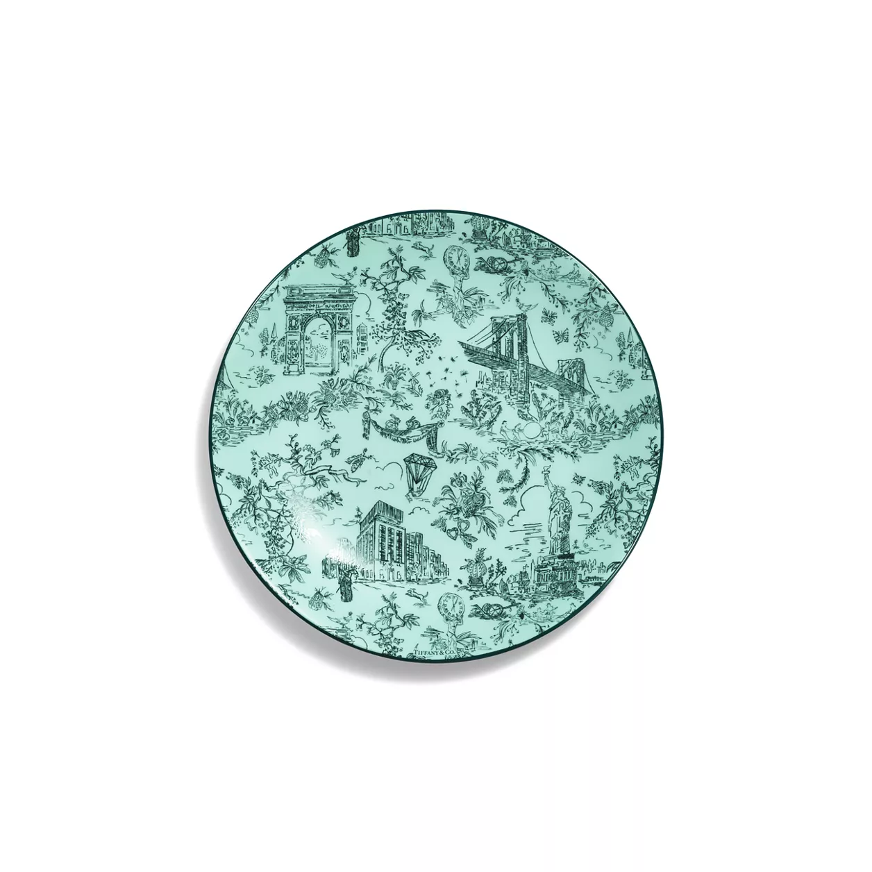 Tiffany Toile Designs sind eine originelle Hommage an Tiffanys Heimatstadt und Tradition. Das verspielte und zugleich elegante Kunstwerk ist von einer Illustration von New York aus dem Tiffany Archiv inspiriert. Die Brooklyn Bridge trifft auf Bird on a Rock, die Freiheitsstatue verschmilzt mit einem Diamanten von Tiffany & Co. Dieser Brot- und Butterteller in Tiffany Blue® besticht mit einem kunstvollen Druck und einem schwarzen, handgemalten Rand. Kombinieren Sie ihn mit Stücken aus der Tiffany Toile Kollektion für einen perfekt abgestimmten Look oder mit unseren anderen Tiffany Home Modellen.