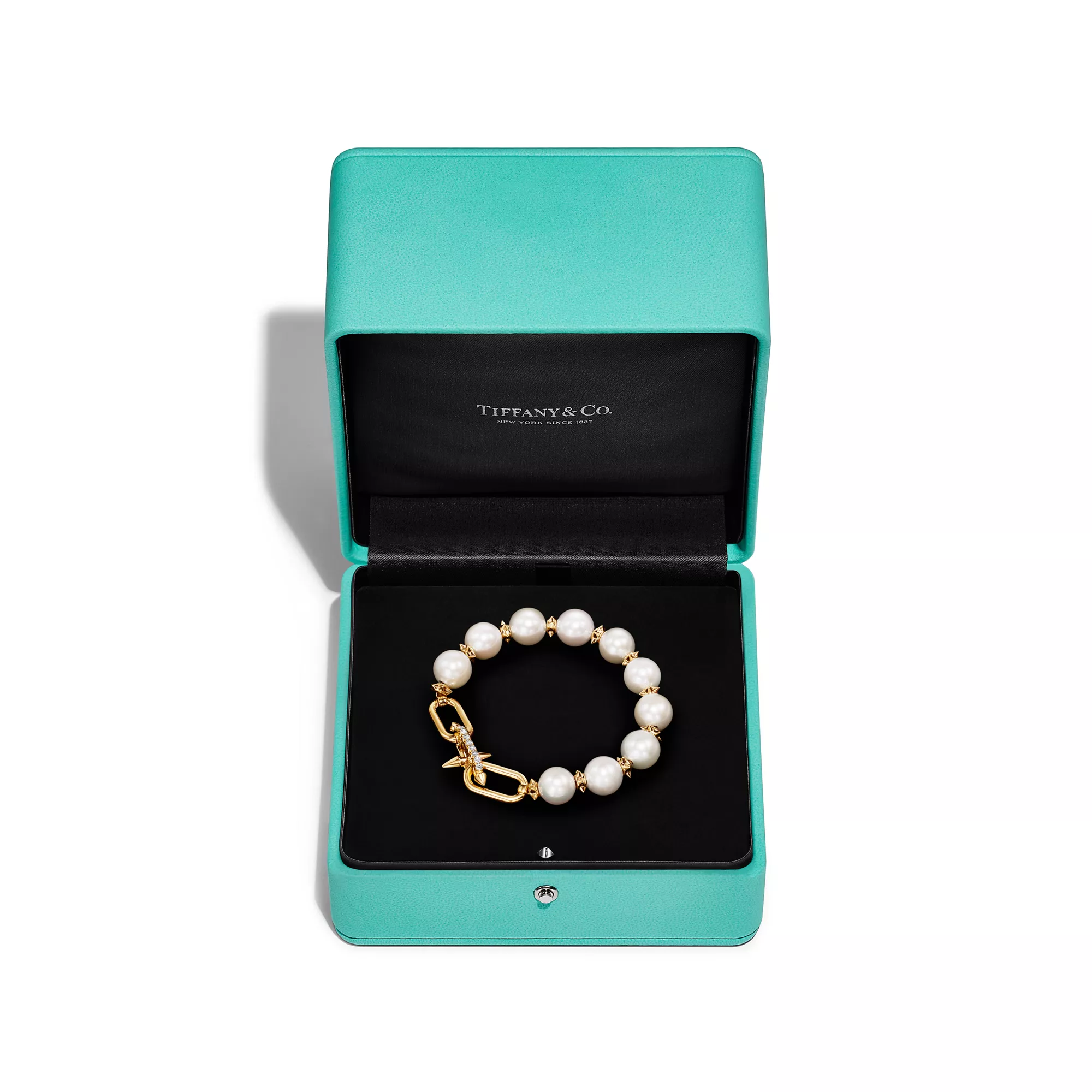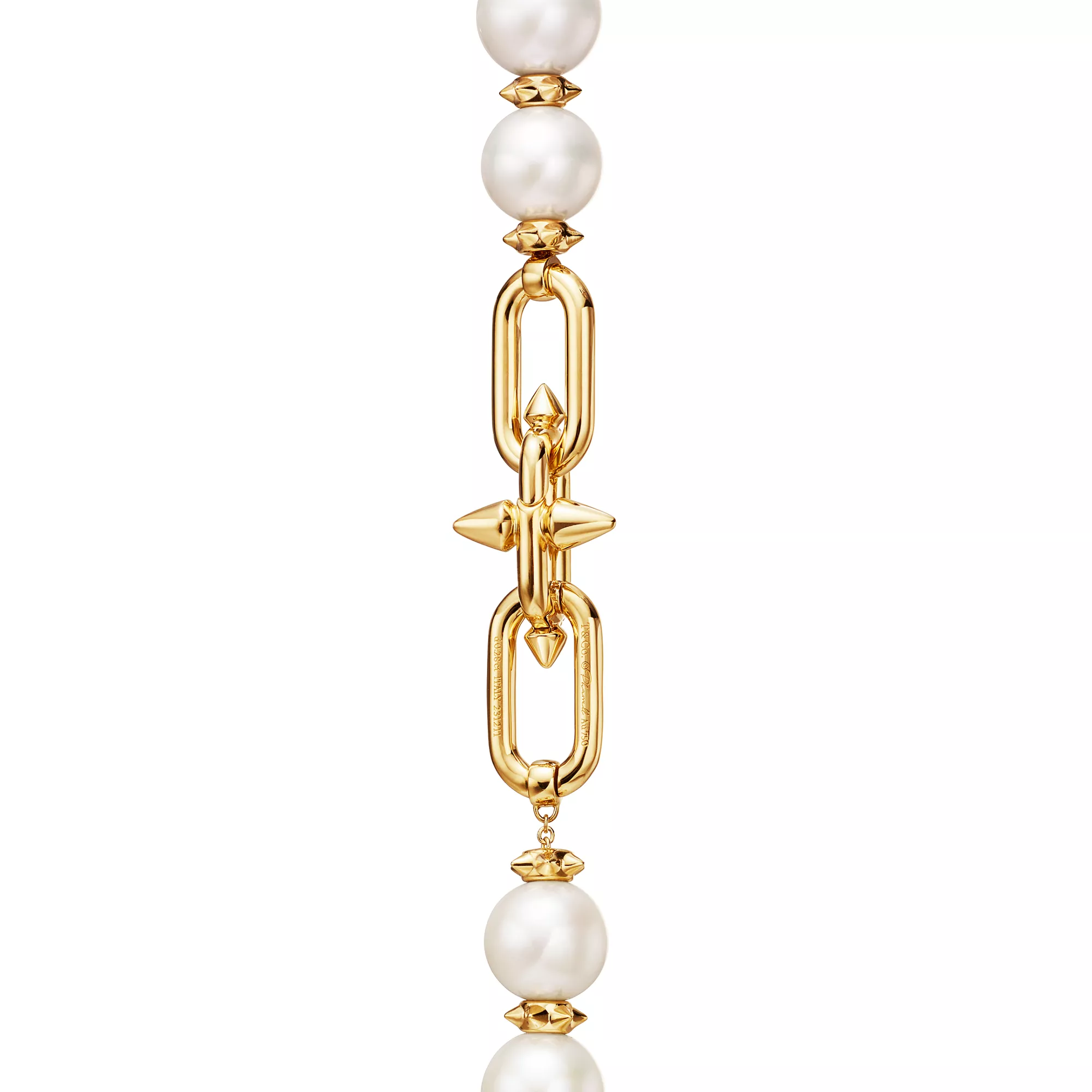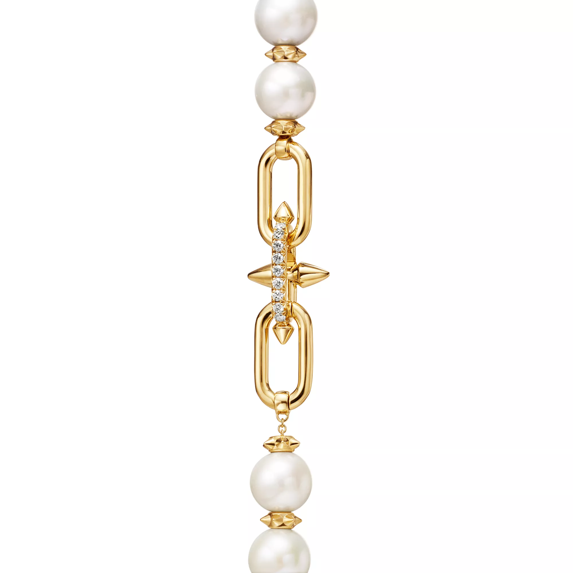 Mit Tiffany Titan by Pharrell Williams – einer Kollektion, die Ausdruck für rebellische Kreativität ist – knüpft das Haus an seine Tradition der Zusammenarbeit mit visionären Künstlern an. Diese Designs sind inspiriert von Poseidon und seinem Dreizack. In 18 Karat Gold gefertigte zackenförmige Rondelle bilden im Wechsel mit großen Perlen einen atemberaubenden Look. Dazu sorgt ein Diamant-Schnappverschluss für maximale Brillanz.