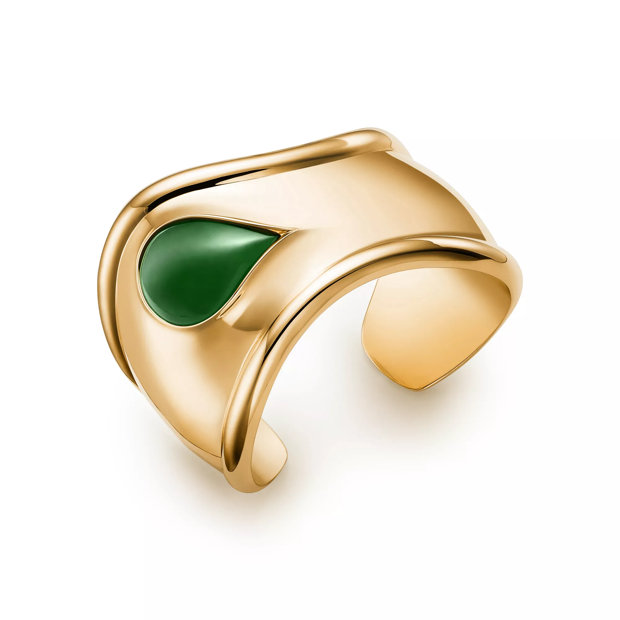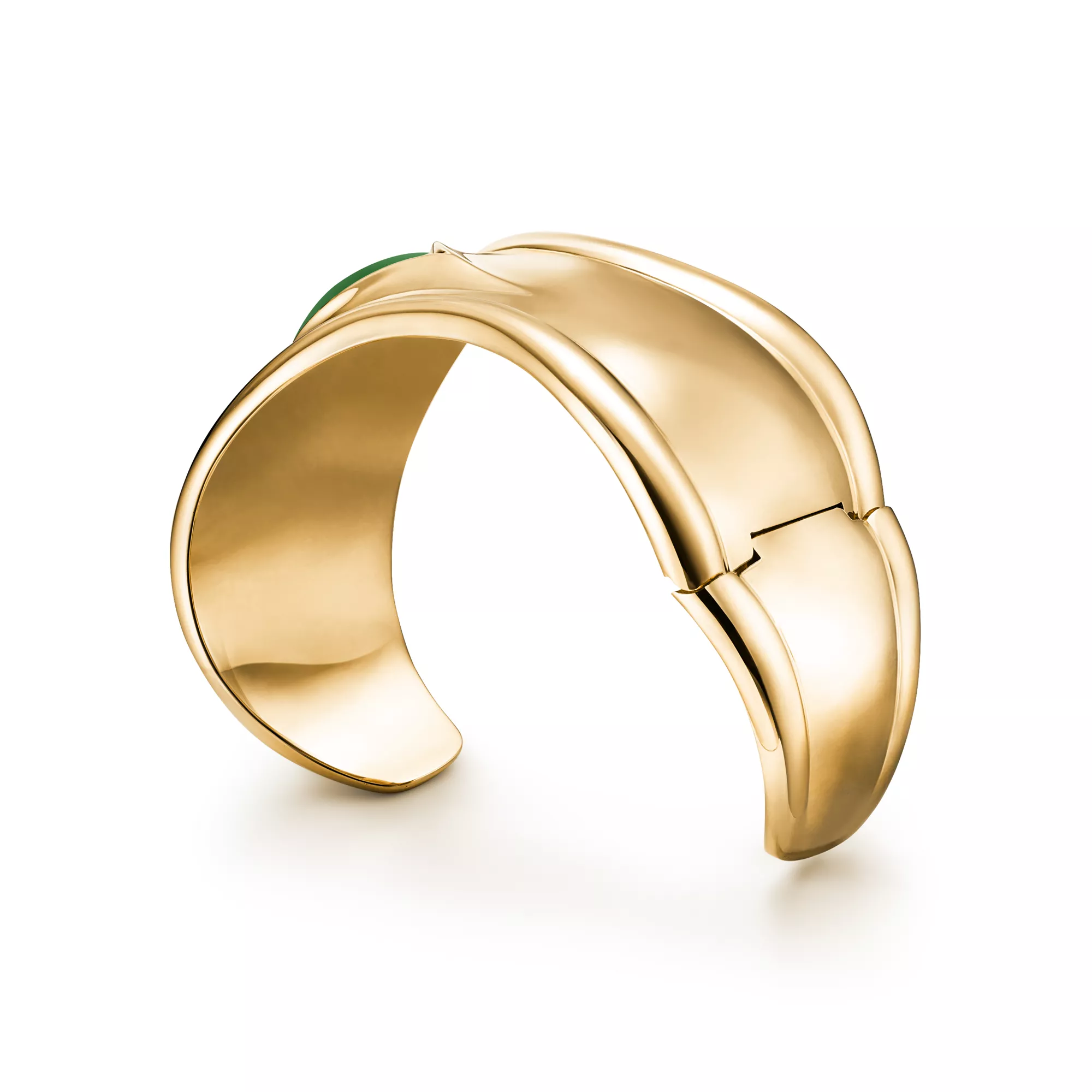 Eine Hommage an die erhabene Schönheit der Natur – Elsa Peretti® Bone Cuffs mit geschliffenem Edelstein werden von meisterhaften Kunsthandwerkern gefertigt, die jeden Edelstein von Hand schleifen und einfassen. Das bahnbrechende Bone Cuff Design wurde erstmals in den 1970ern vorgestellt und ist sehr feminin und mühelos elegant. Dieser Bone Cuff in 18 Karat Gold, eine besondere Interpretation des ikonischen Designs, ist eine Hommage an die Schönheit der von Hand gesetzten grünen Nephrit-Jade und spiegelt die Leidenschaft der Designerin für glatte, skulpturale Oberflächen wider.