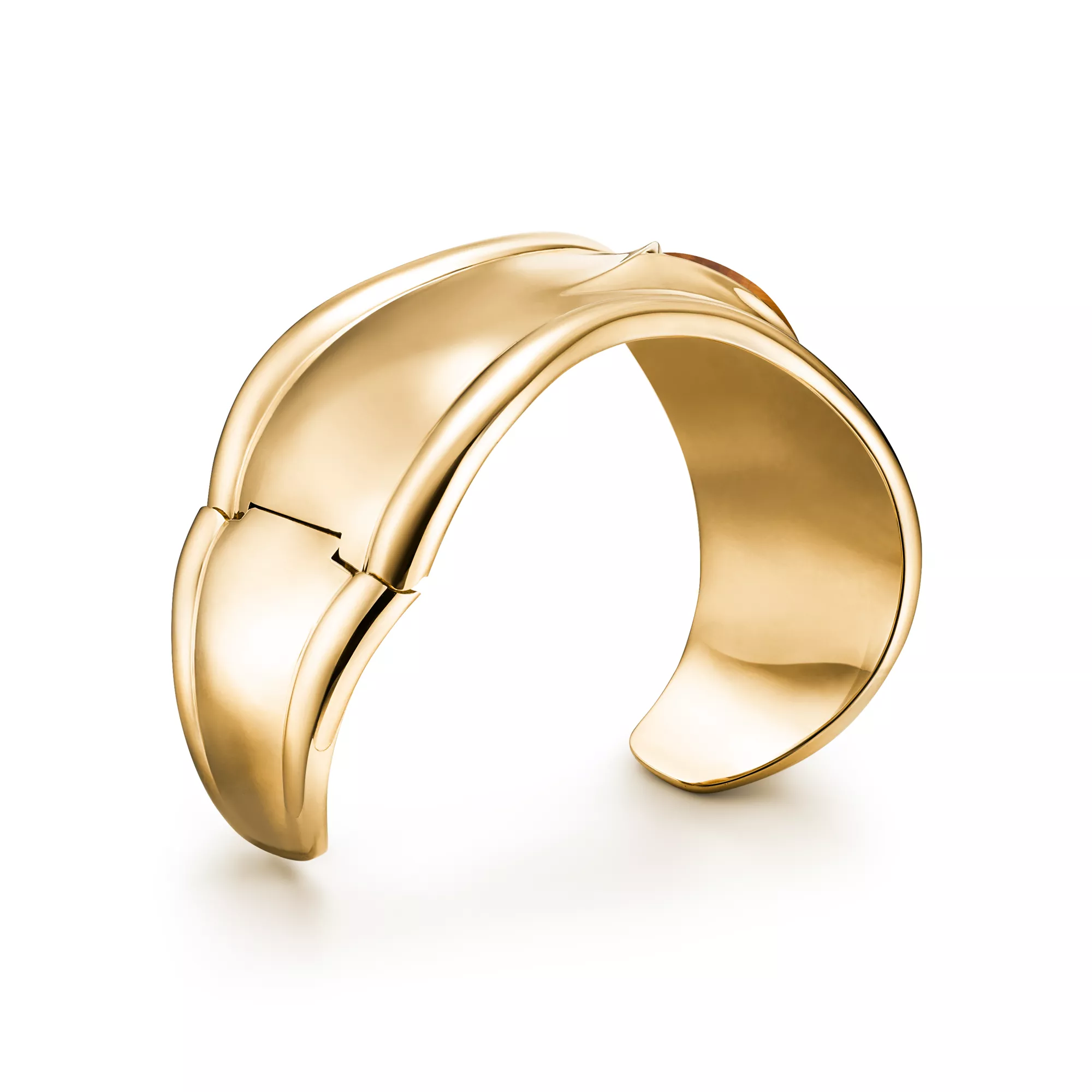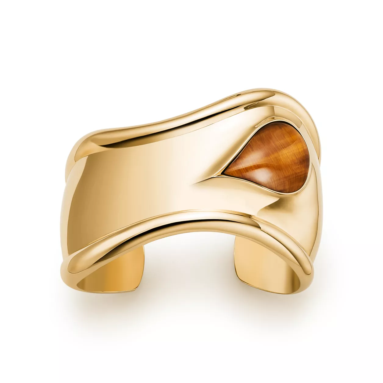Eine Hommage an die erhabene Schönheit der Natur – Elsa Peretti® Bone Cuffs mit geschliffenem Edelstein werden von meisterhaften Kunsthandwerkern gefertigt, die jeden Edelstein von Hand schleifen und einfassen. Das bahnbrechende Bone Cuff Design wurde erstmals in den 1970ern vorgestellt und ist sehr feminin und mühelos elegant. Dieser Bone Cuff in 18 Karat Gelbgold, eine besondere Interpretation des ikonischen Designs, ist eine Hommage an die Schönheit des von Hand gesetzten Tigereisens und spiegelt die Leidenschaft der Designerin für glatte, skulpturale Oberflächen wider.