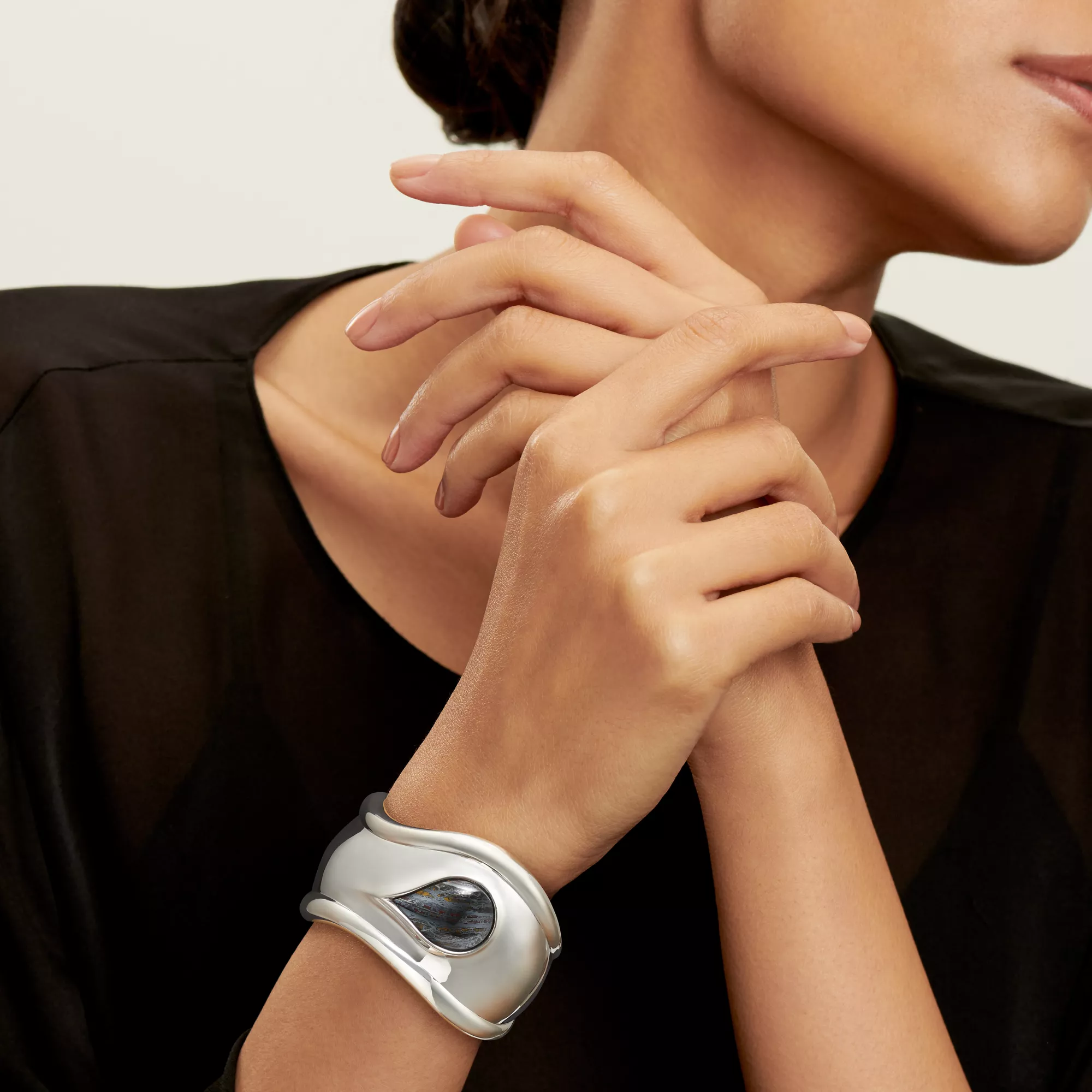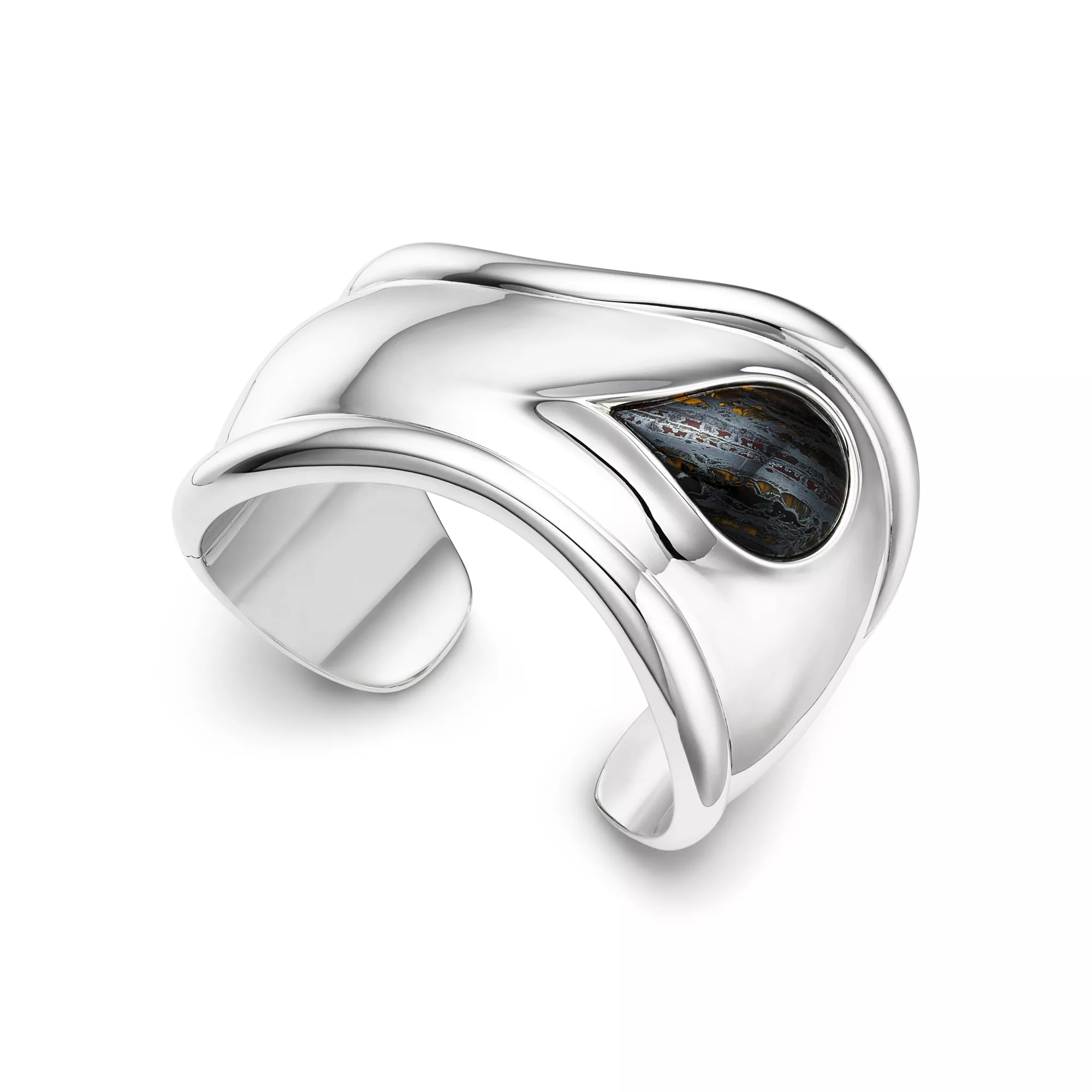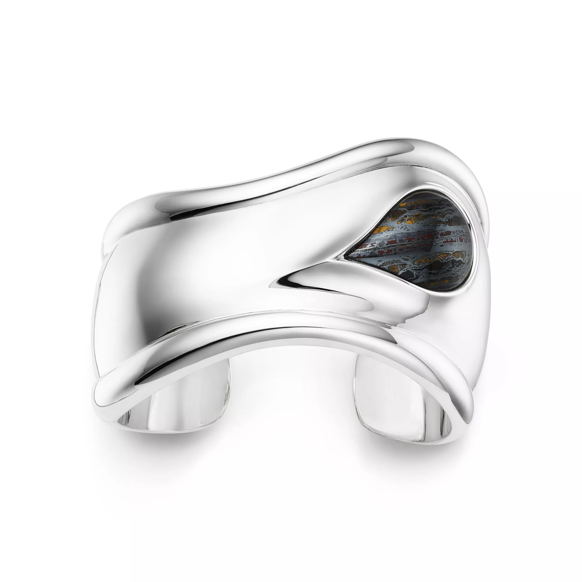 Eine Hommage an die erhabene Schönheit der Natur – Elsa Peretti® Bone Cuffs mit geschliffenem Edelstein werden von meisterhaften Kunsthandwerkern gefertigt, die jeden Edelstein von Hand schleifen und einfassen. Das bahnbrechende Bone Cuff Design wurde erstmals in den 1970ern vorgestellt und ist sehr feminin und mühelos elegant. Dieser Bone Cuff in Sterlingsilber, eine besondere Interpretation des ikonischen Designs, ist eine Hommage an die Schönheit des von Hand gesetzten Tigereisens und spiegelt die Leidenschaft der Designerin für glatte, skulpturale Oberflächen wider.