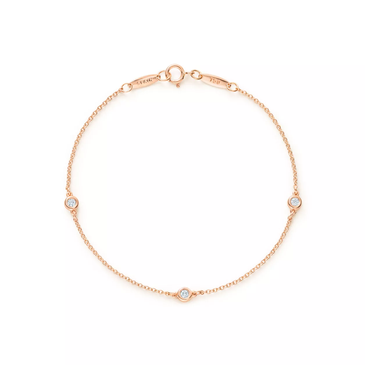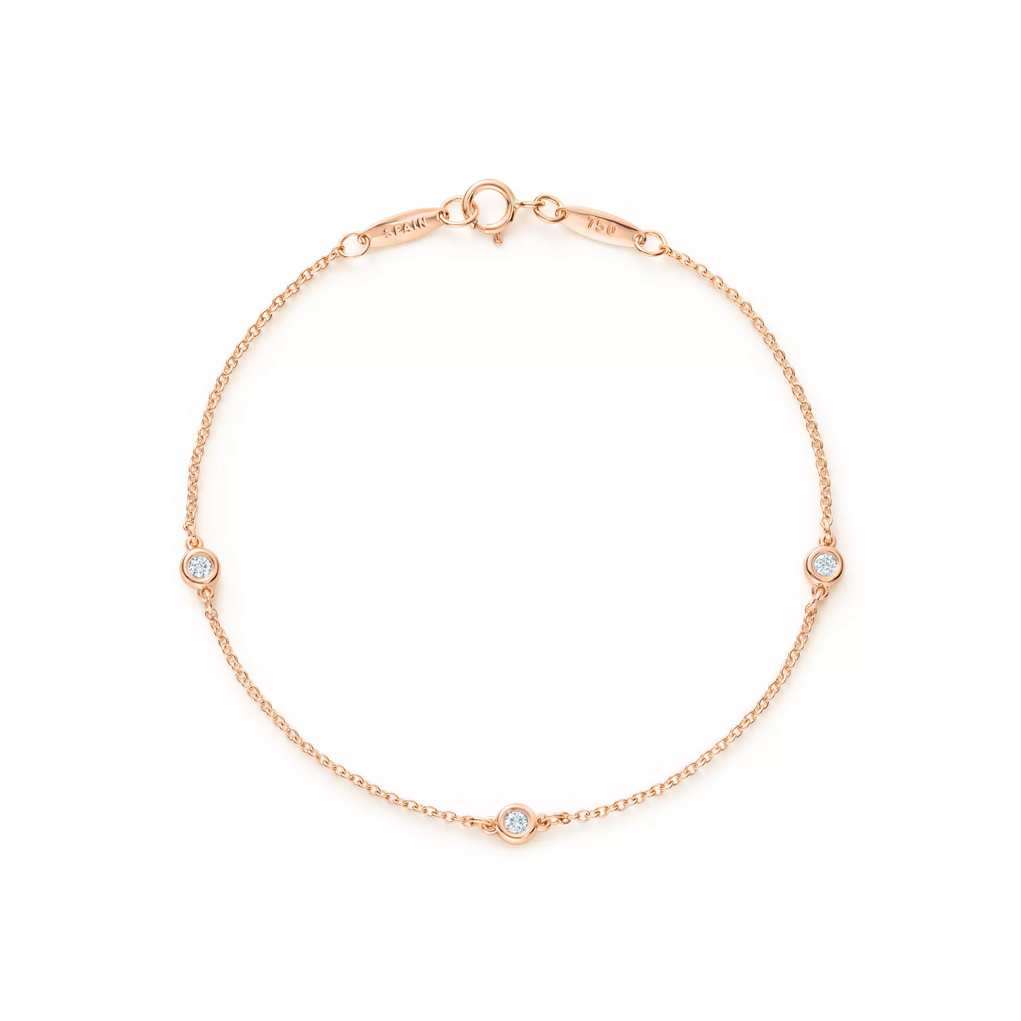 Die runden Tiffany-Diamanten fangen das Licht ein und bringen es zum Tanzen. Armband in 18 Karat Roségold mit Diamanten im runden Brillantschliff. 17,8 cm lang. Gesamtkaratgewicht 0,09. Copyright der Originaldesigns bei Elsa Peretti.