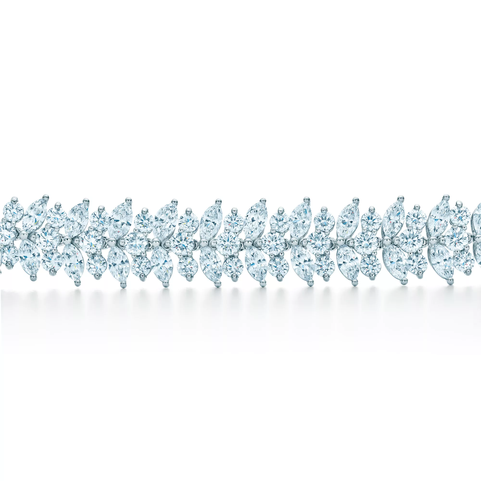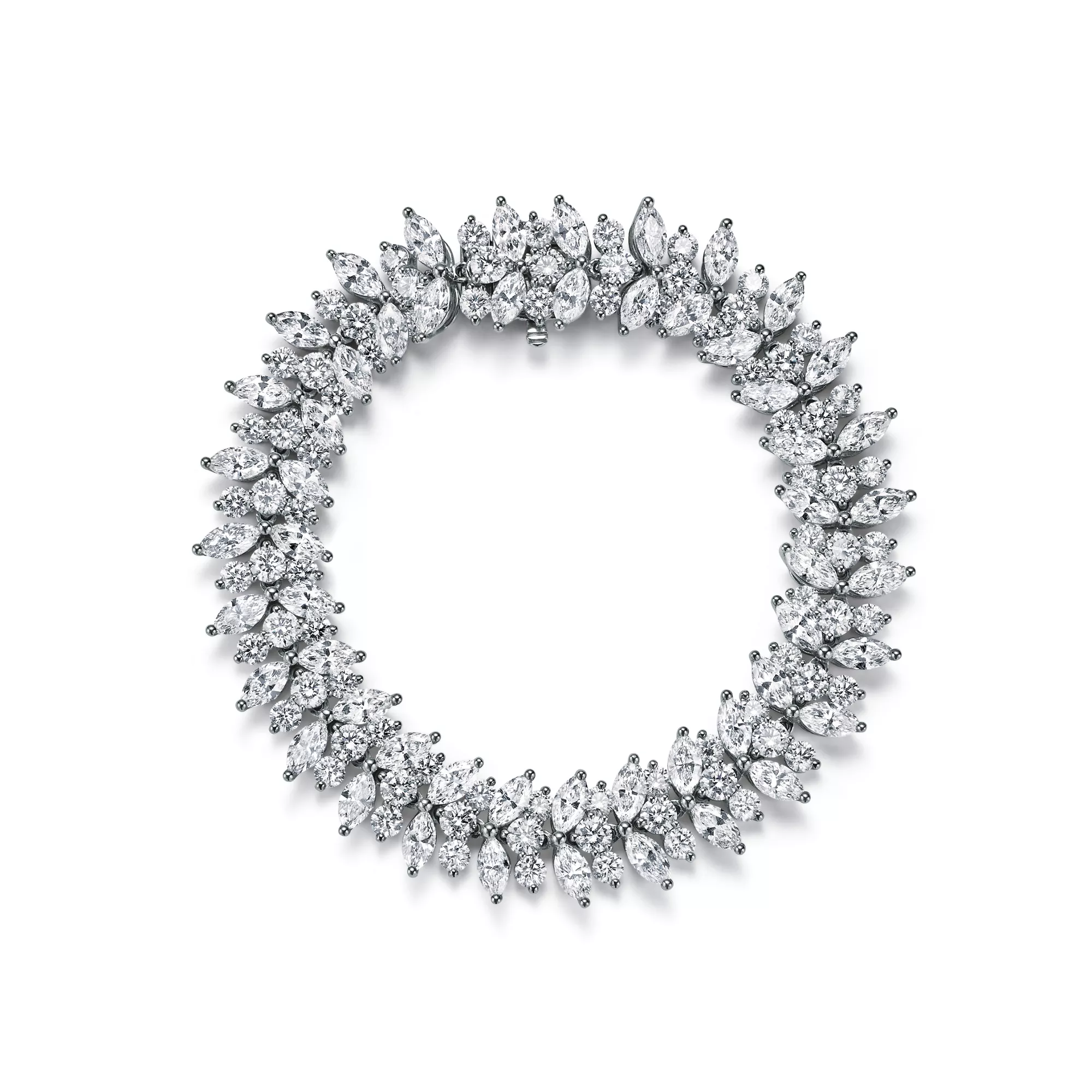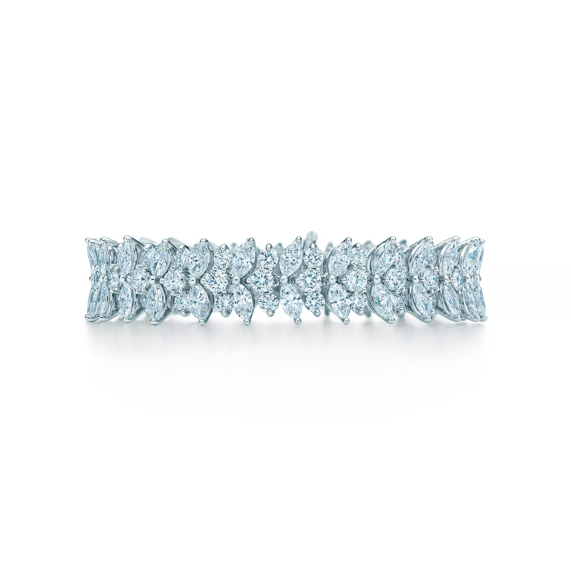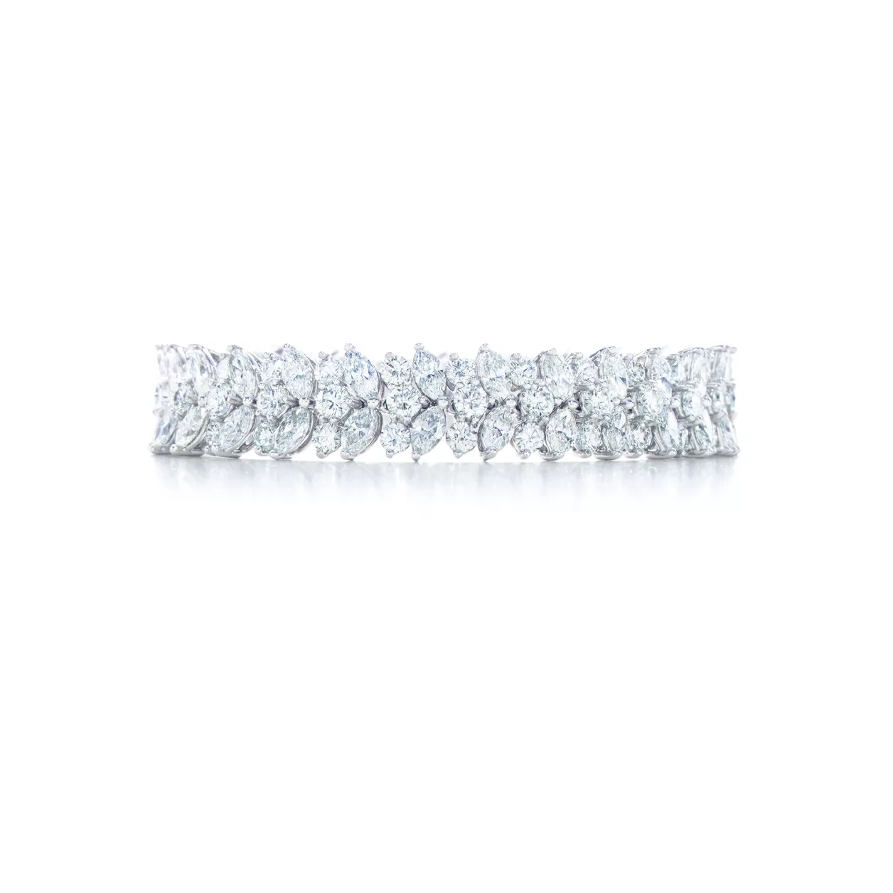 Dieses filigran gefertigte Cluster-Armband aus 135 Diamanten in Platin verströmt einen spektakulären Lichtregen. Diamanten im Marquiseschliff, Gesamtkaratgewicht 11,01;Diamanten im runden Brillantschliff, Gesamtkaratgewicht 9,22.