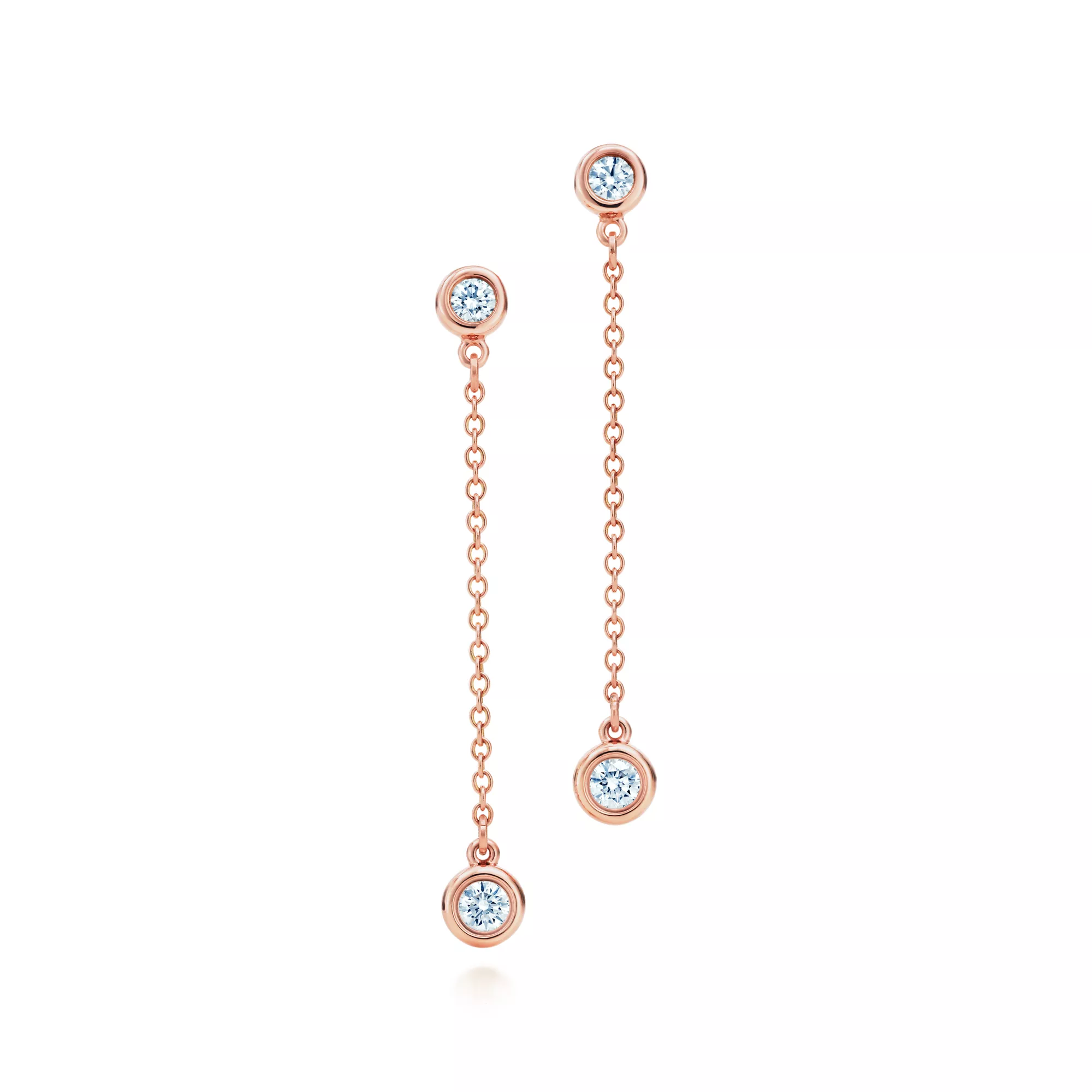 Die runden Tiffany Diamanten fangen das Licht ein und bringen es zum Tanzen. Ohrringe in 18 Karat Roségold mit vier Diamanten im runden Brillantschliff. Gesamtkaratgewicht 0,24. Copyright der Originaldesigns bei Elsa Peretti.