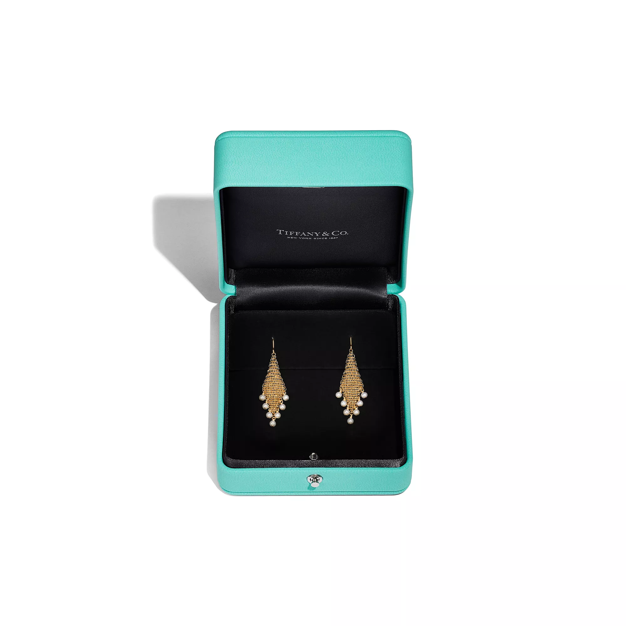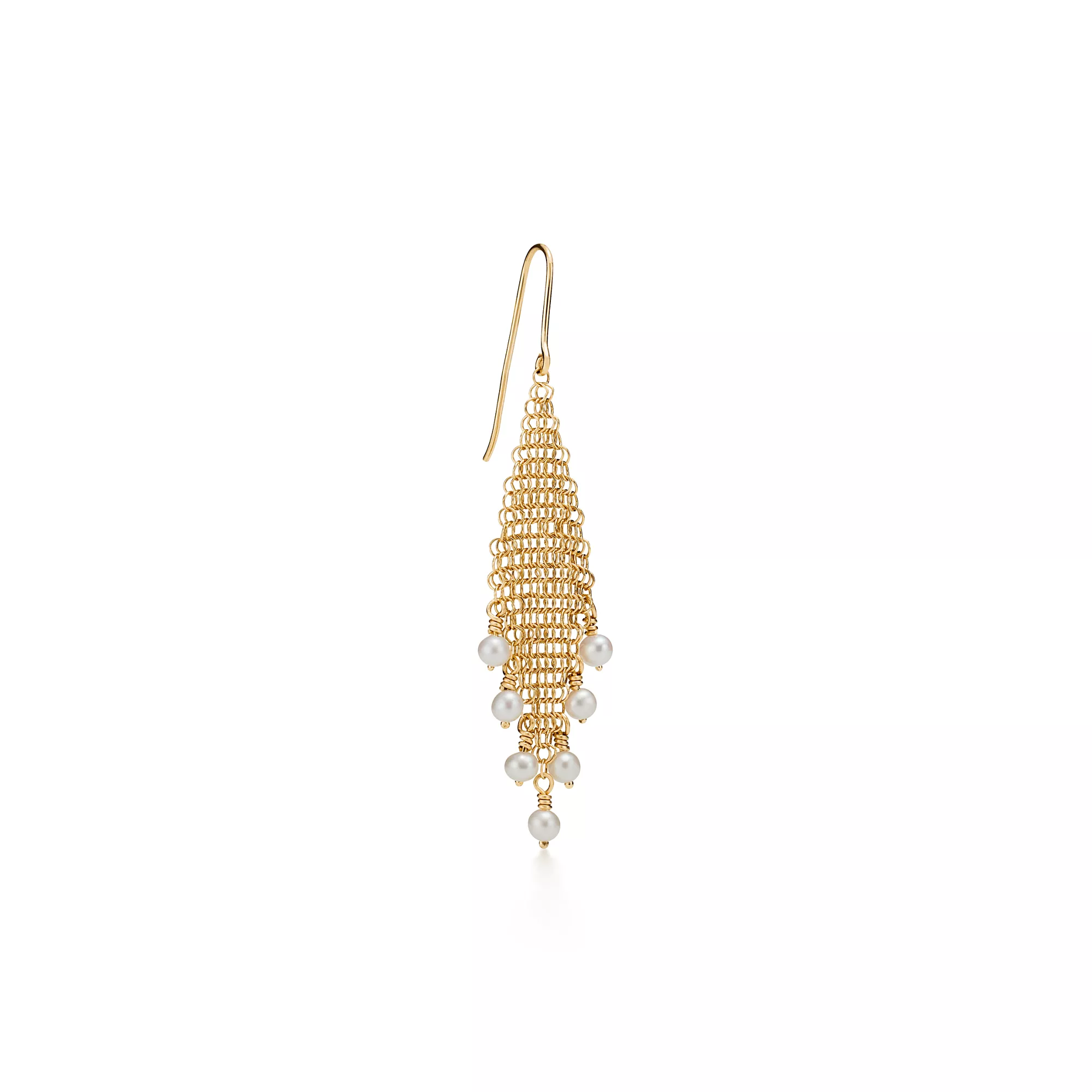 Die Form passt sich an und fällt ergonomisch fließend über die Konturen des Körpers. Fransenohrringe aus 18 Karat Gold mit Süßwasserzuchtperlen. 5 cm lang. Perlen, 2,5-3 mm. Copyright der Originaldesigns by Elsa Peretti.