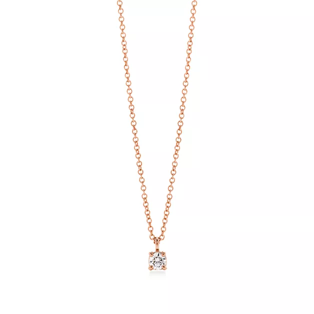 Legendäre Diamanten von höchster Schliffqualität, Farbklasse, Reinheit und Brillanz. Anhänger aus 18 kt. Roségold mit einem runden Brillanten. Mit 41 cm langer Kette. Karatgewicht 0,12 kt.