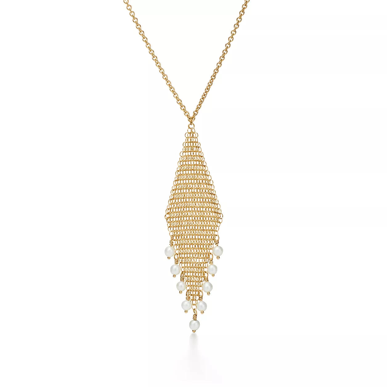Die Form passt sich an und fällt ergonomisch fließend über die Konturen des Körpers. Fransenanhänger aus 18 Karat Gold mit Süßwasserzuchtperlen. Mit 40,5 cm langer Kette. Perlen, 2,5-3 mm. Copyright der Originaldesigns by Elsa Peretti.
