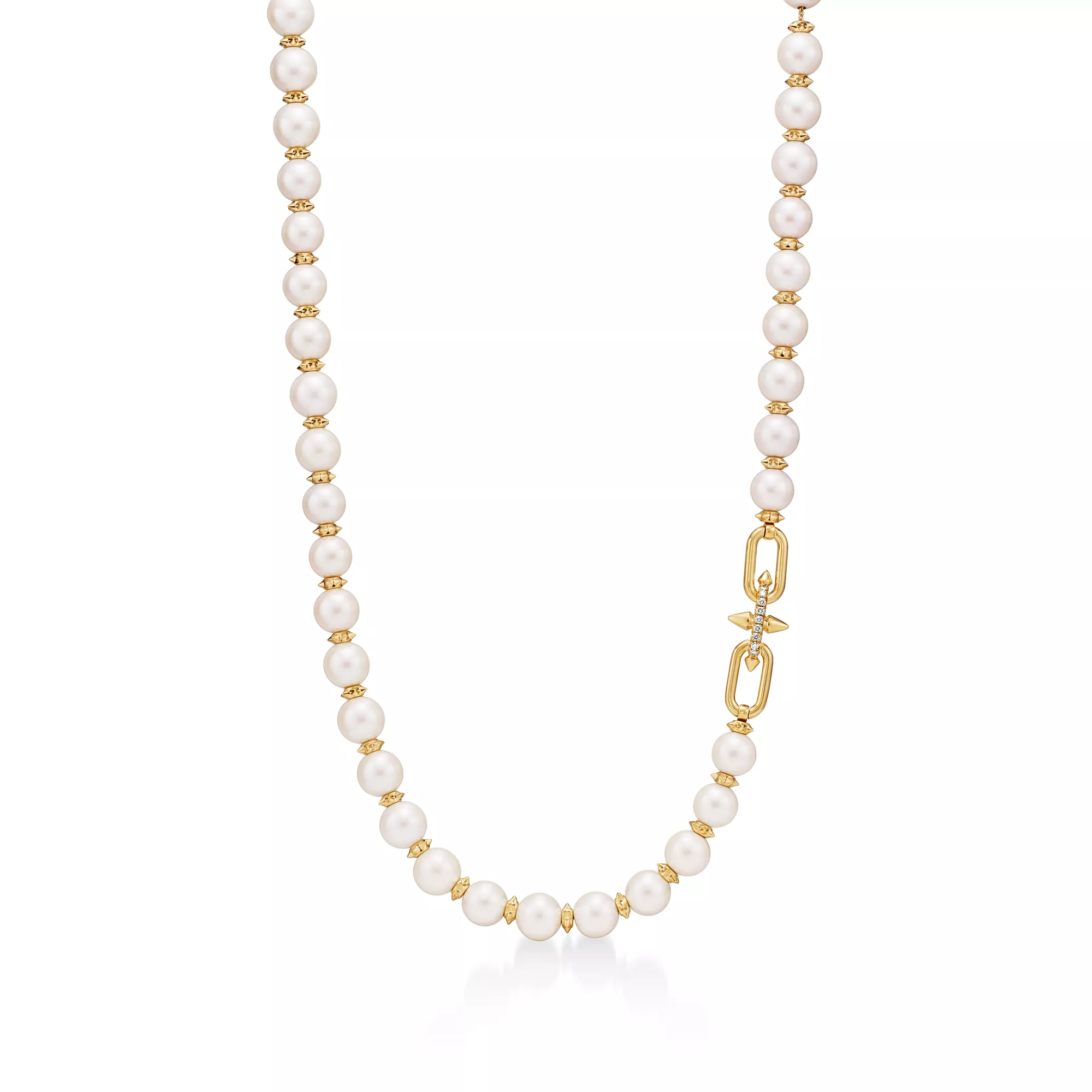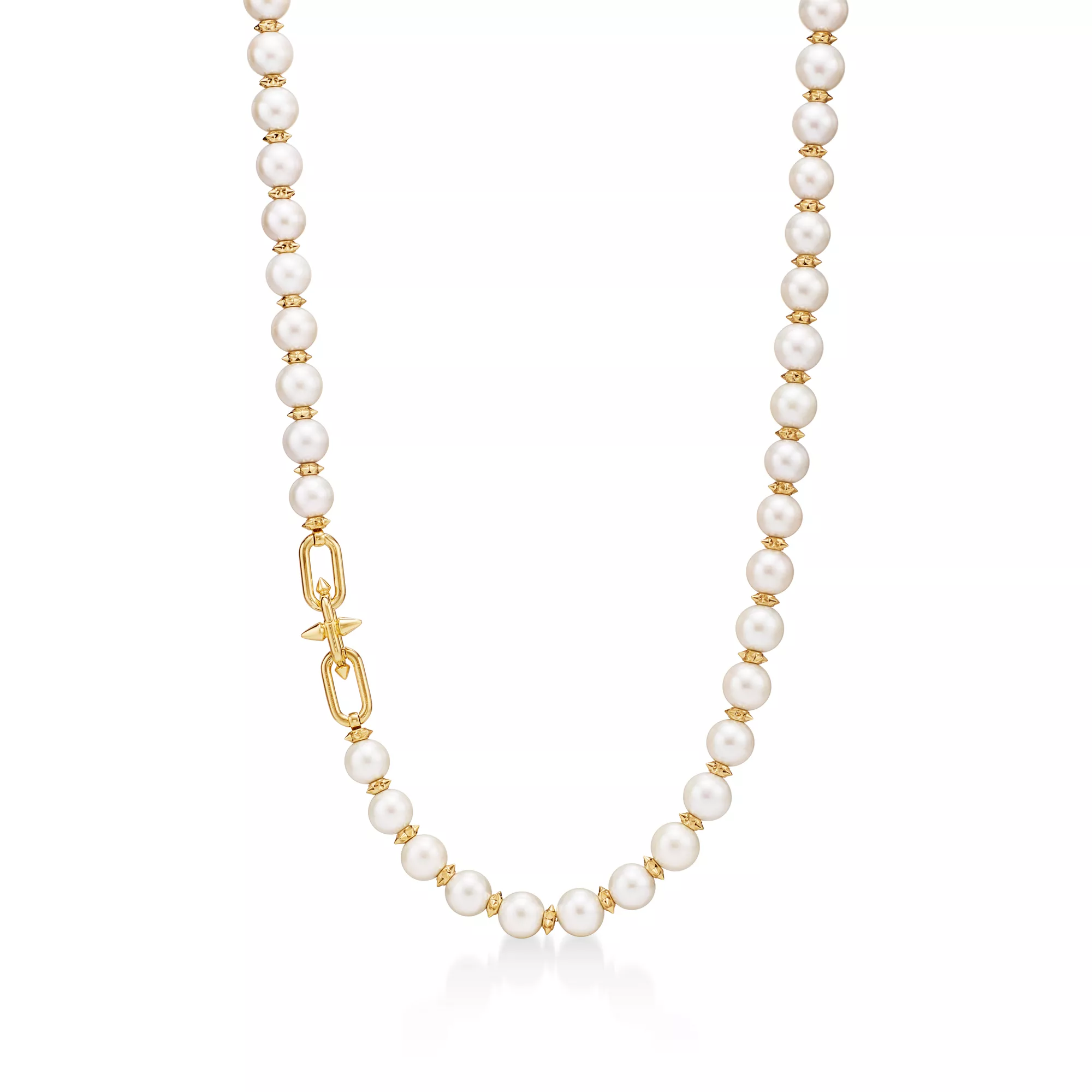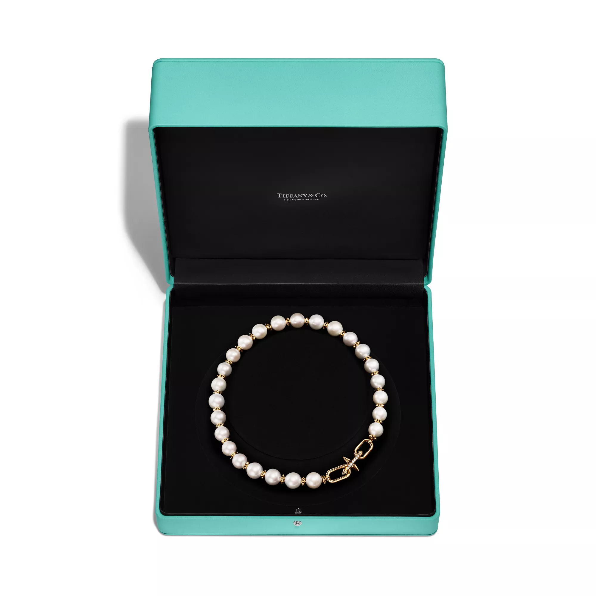 Mit Tiffany Titan by Pharrell Williams – einer Kollektion, die Ausdruck für rebellische Kreativität ist – knüpft das Haus an seine Tradition der Zusammenarbeit mit visionären Künstlern an. Diese Designs sind inspiriert von Poseidon und seinem Dreizack. In 18 Karat Gold gefertigte zackenförmige Rondelle bilden im Wechsel mit großen Perlen einen atemberaubenden Look. Dazu sorgt ein Diamant-Schnappverschluss für maximale Brillanz.