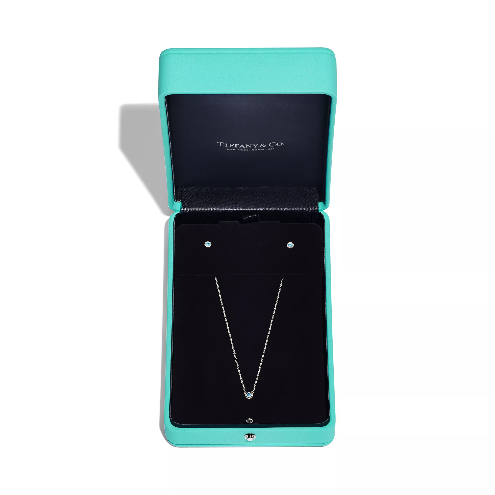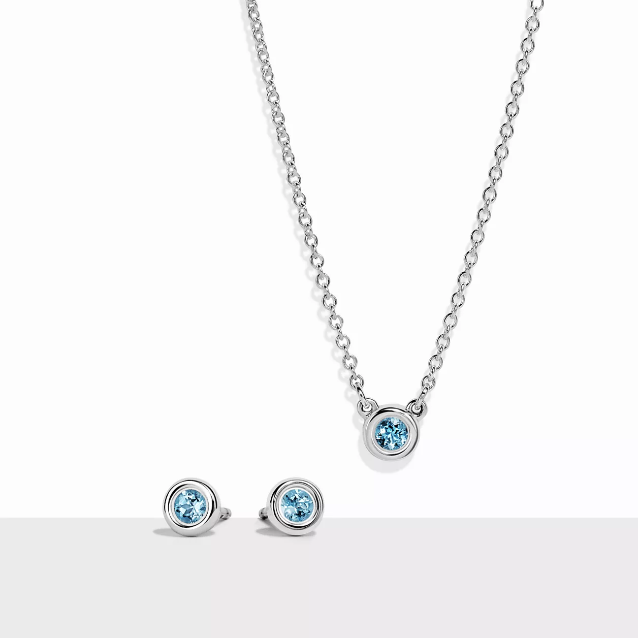 Die Elsa Peretti® Color by the Yard-Kollektion zeichnet sich durch kesselförmige Steine aus, die auf der Haut glänzen. Dieses Set vereint den Aquamarin-Anhänger der Kollektion mit einem Paar Aquamarin-Ohrringe, beide aus Sterlingsilber gefertigt. Tragen Sie die beiden Schmuckstücke zusammen, um eine maximale Wirkung zu erzielen. Das Set wird mit einer Schmuckschatulle in Tiffany Blue® als Andenken geliefert.