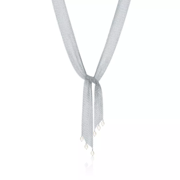 Die Form passt sich an und fällt ergonomisch fließend über die Konturen des Körpers. Knotenhalskette aus Sterlingsilber mit Süßwasserzuchtperlen. 124,5 cm lang. Perlen, 5-5,5mm. Copyright der Originaldesigns by Elsa Peretti.