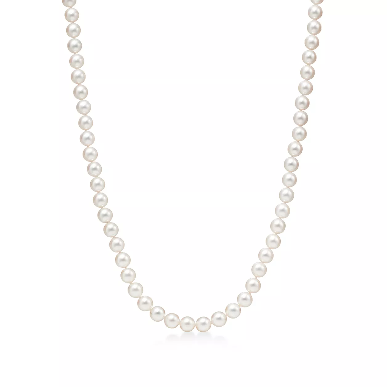 Halskette aus Akoya-Zuchtperlen mit Verschluss in 18 Karat Weißgold. 45,7 cm lang. Am dekorativen Schild in 18 Karat Weißgold ist der Schriftzug „Tiffany & Co.“ eingraviert. Perlen, 6,5 bis 7 mm.