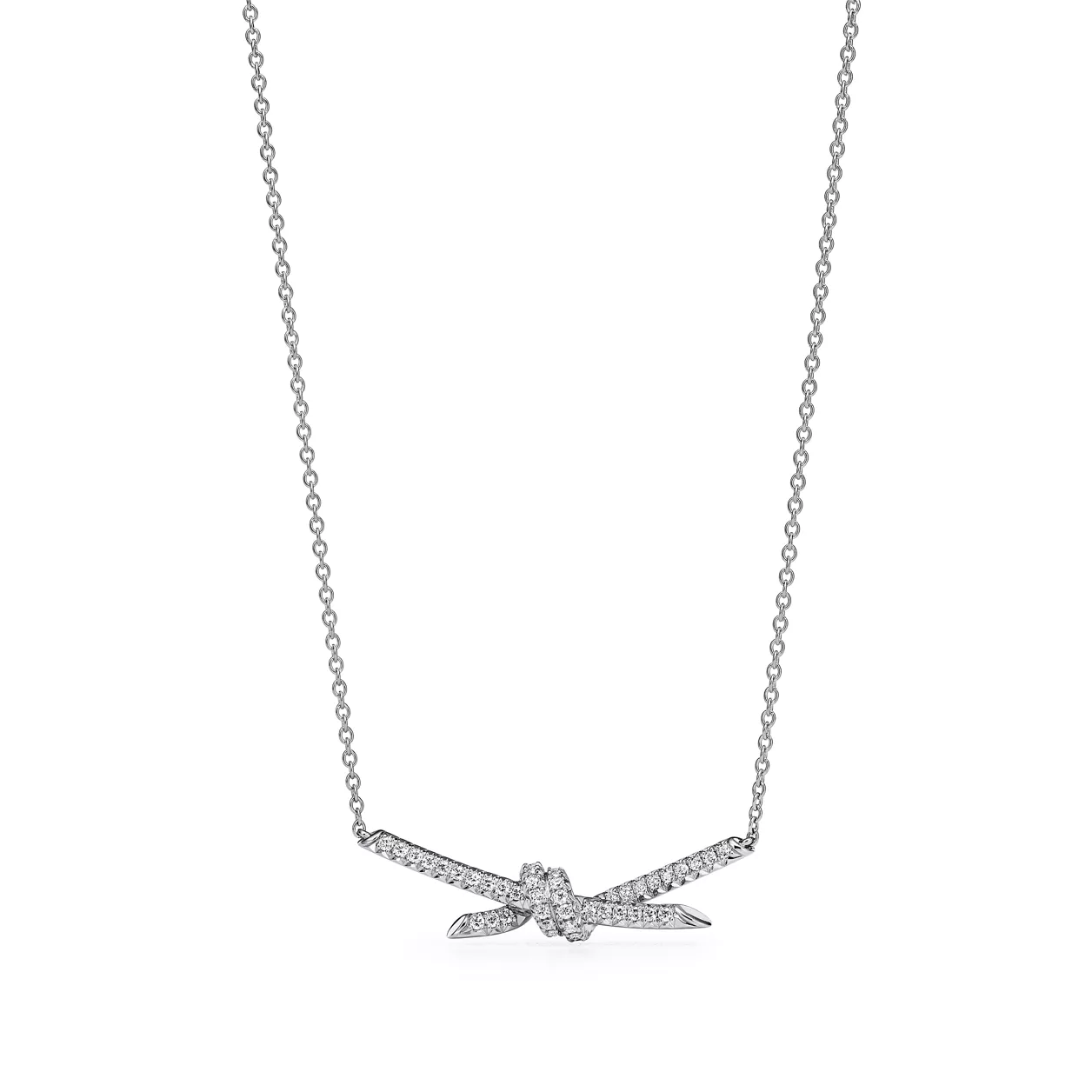 Die verschlungenen Enden des charakteristischen Tiffany Knot Motivs symbolisieren die Kraft der zwischenmenschlichen Beziehungen. Jedes Design der Tiffany Knot Kollektion ist ein komplexes Stück Handwerkskunst und bietet ein harmonisches Gleichgewicht zwischen Stärke und Eleganz. Dieser Anhänger ist aus Weißgold gefertigt und wurde von Hand auf Hochglanz poliert. Jeder Diamant im runden Brillantschliff wurde sorgfältig ausgewählt, um die hohen Standards von Tiffany zu erfüllen. Für maximale Brillanz erfolgt die Setzung in präzisen Winkeln von Hand. Tragen Sie diesen Anhänger einzeln oder zusammen mit Anhängern in verschiedenen Längen für einen extravaganten Look.