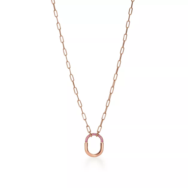 Tiffany Lock, inspiriert von einem Vorhängeschloss aus dem Tiffany Archiv aus dem Jahr 1883, ist ein Symbol der ewigen Liebe. Lock ist ein universelles Symbol für das, was am wichtigsten ist, und dafür bestimmt, Geliebtes zu bewahren. Dieser von Tiffany Kunsthandwerkern meisterhaft gefertigte Anhänger besticht durch eine eindrucksvolle Kombination aus 18 Karat Roségold und rosa Saphiren. Jeder rosa Saphir wurde sorgfältig ausgewählt, um die hohen Standards von Tiffany zu erfüllen. Für maximale Brillanz erfolgt die Setzung in präzisen Winkeln von Hand. Kombinieren Sie diesen Anhänger mit anderen Designs aus der Kollektion für einen extravaganten Look.