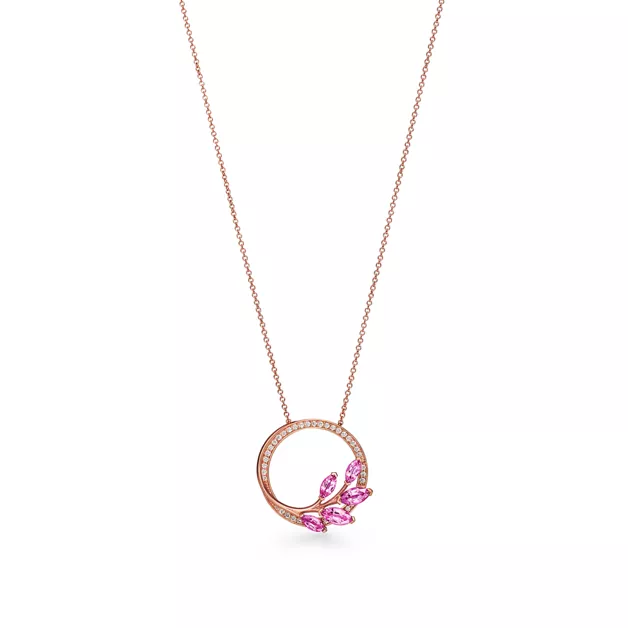 Mit einer Intensität, die den Sternen am Nachthimmel gleicht, zelebriert Tiffany Victoria® die leuchtende Brillanz von Tiffany Diamanten. Unterschiedlich geschliffene Diamanten und rosa Saphire verleihen den fließenden Blättern dieses atemberaubenden Anhängers Dimension.