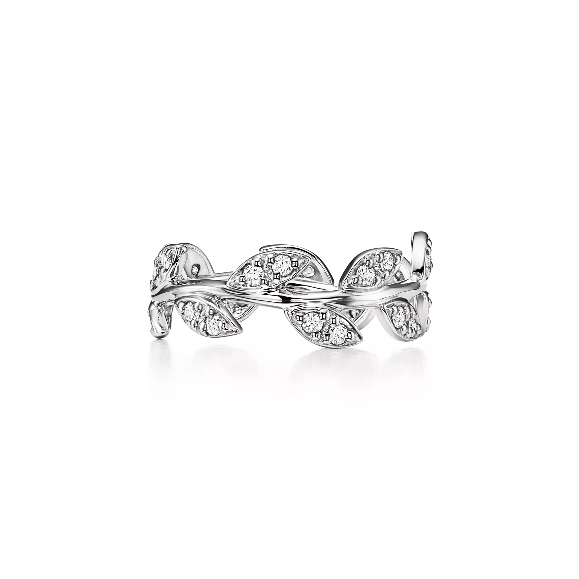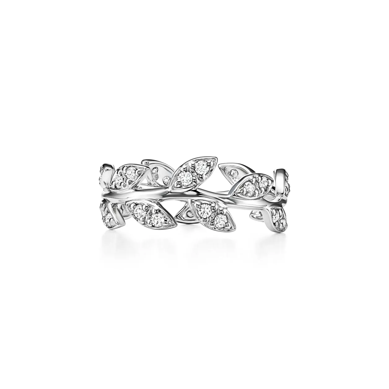 Mit schön geformten Diamantblättern ehrt Paloma den Ölzweig als Symbol für Frieden und Fülle. Schmaler Bandring aus 18 kt. Weißgold mit runden Brillanten. Gesamtkaratgewicht 0,28 kt. Copyright der Originaldesigns by Paloma Picasso®.