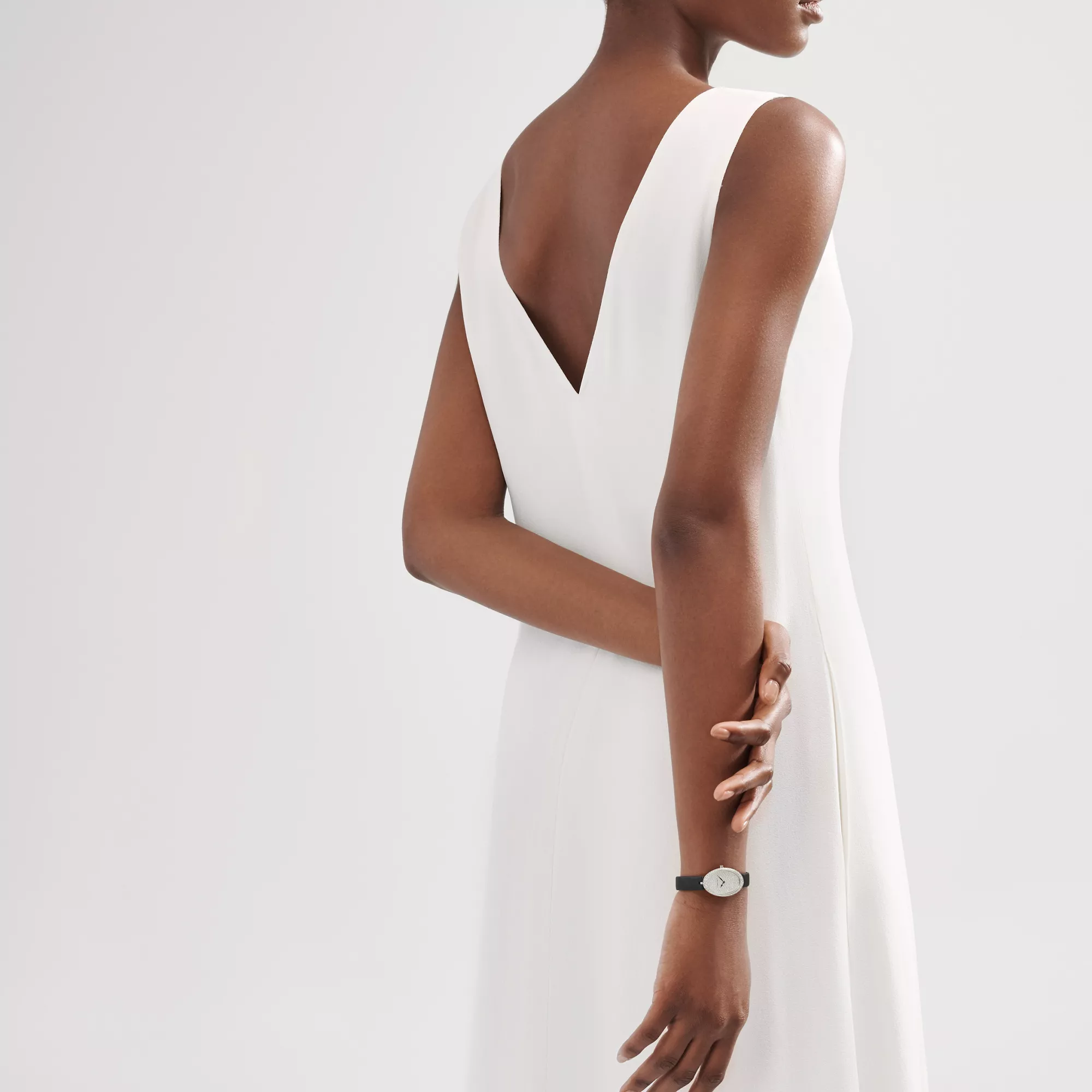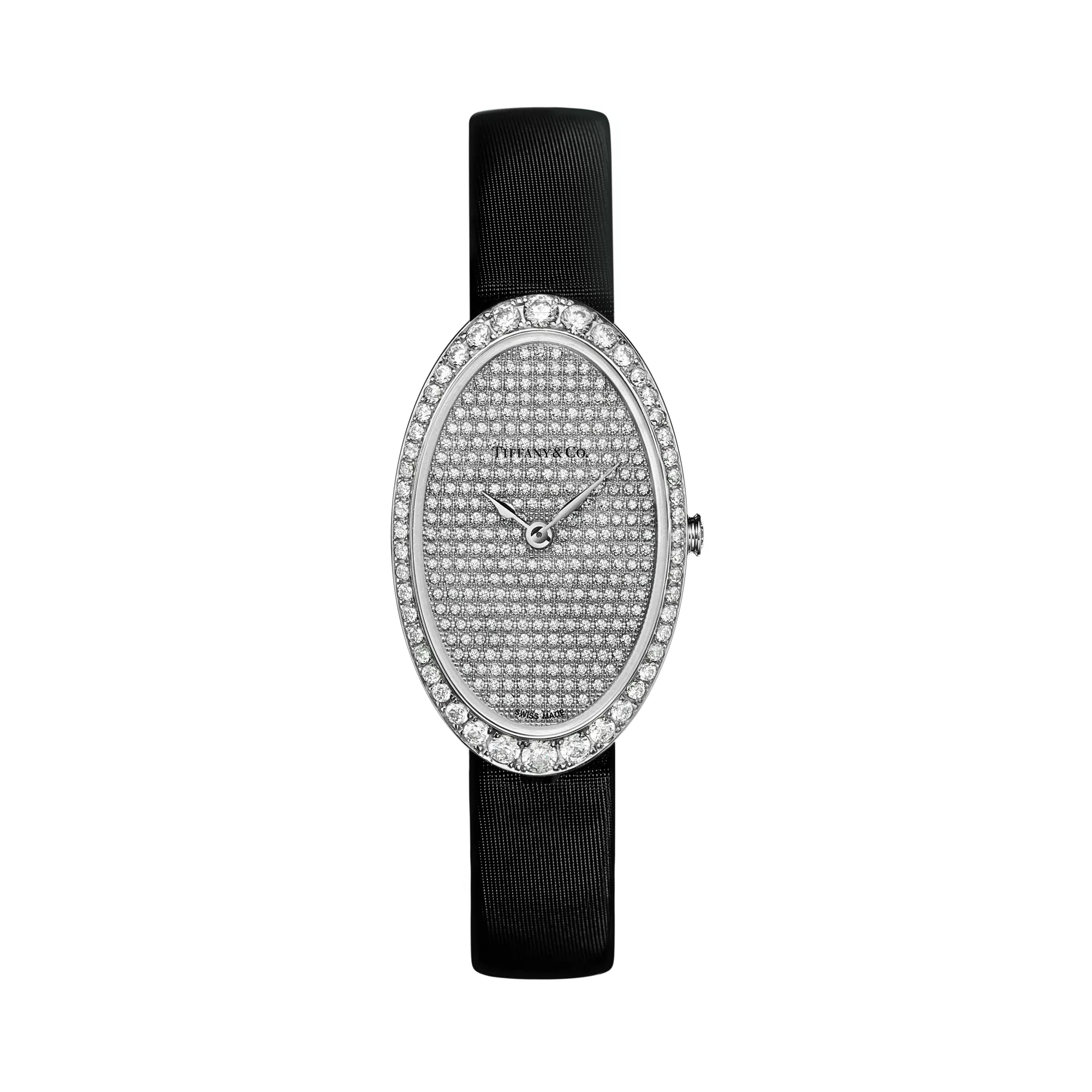Damenuhr in 18 Karat Weißgold. Zifferblatt mit Pavé-Diamanten. An einem schwarzen Satinarmband mit Diamantschließe. Gehäuse mit Diamanten im runden Brillantschliff, 21 x 34 mm. Quarzuhrwerk. Wasserdicht bis 30 Meter Tiefe (3 bar). Swiss-made. Gesamtkaratgewicht 1,41.