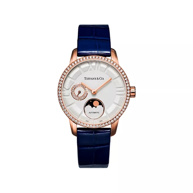 Inspiriert von den klaren Linien der römischen Ziffern der Uhr, die über dem Eingang von The Landmark thront, verbindet die Atlas® Uhrenkollektion grafische Klarheit mit perfekter Technik. Diese runde 34-mm-Uhr ist aus Roségold mit Diamanten und einem weißen Opalin-Zifferblatt gestaltet. Darüber hinaus bietet sie eine Mondphasenkomplikation, die die vier Phasen des Mondes anzeigt.