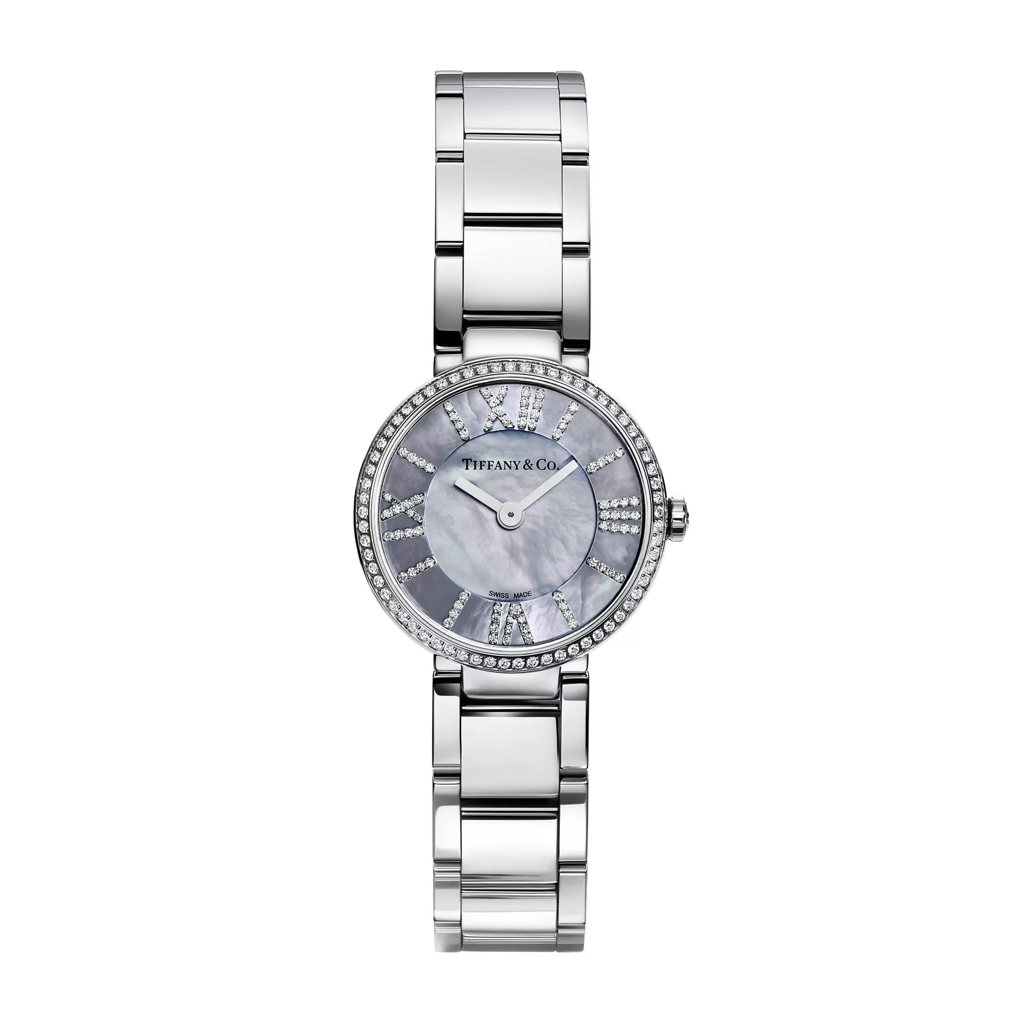 Inspiriert von den klaren Linien der römischen Ziffern in der Uhr über dem Eingang des Tiffany Flagship Store an der Fifth Avenue, verbindet die Atlas® Uhrenkollektion grafische Klarheit mit funktionaler Eleganz für Stücke, die ganz einfach jeden Tag getragen werden können. Diese runde 24-mm-Uhr ist aus Edelstahl mit raffinierten Diamant-Akzenten und einem Zifferblatt mit grauem Perlmutt gestaltet und stellt damit eine moderne Neuauflage eines kraftvollen und elementaren Designs dar.