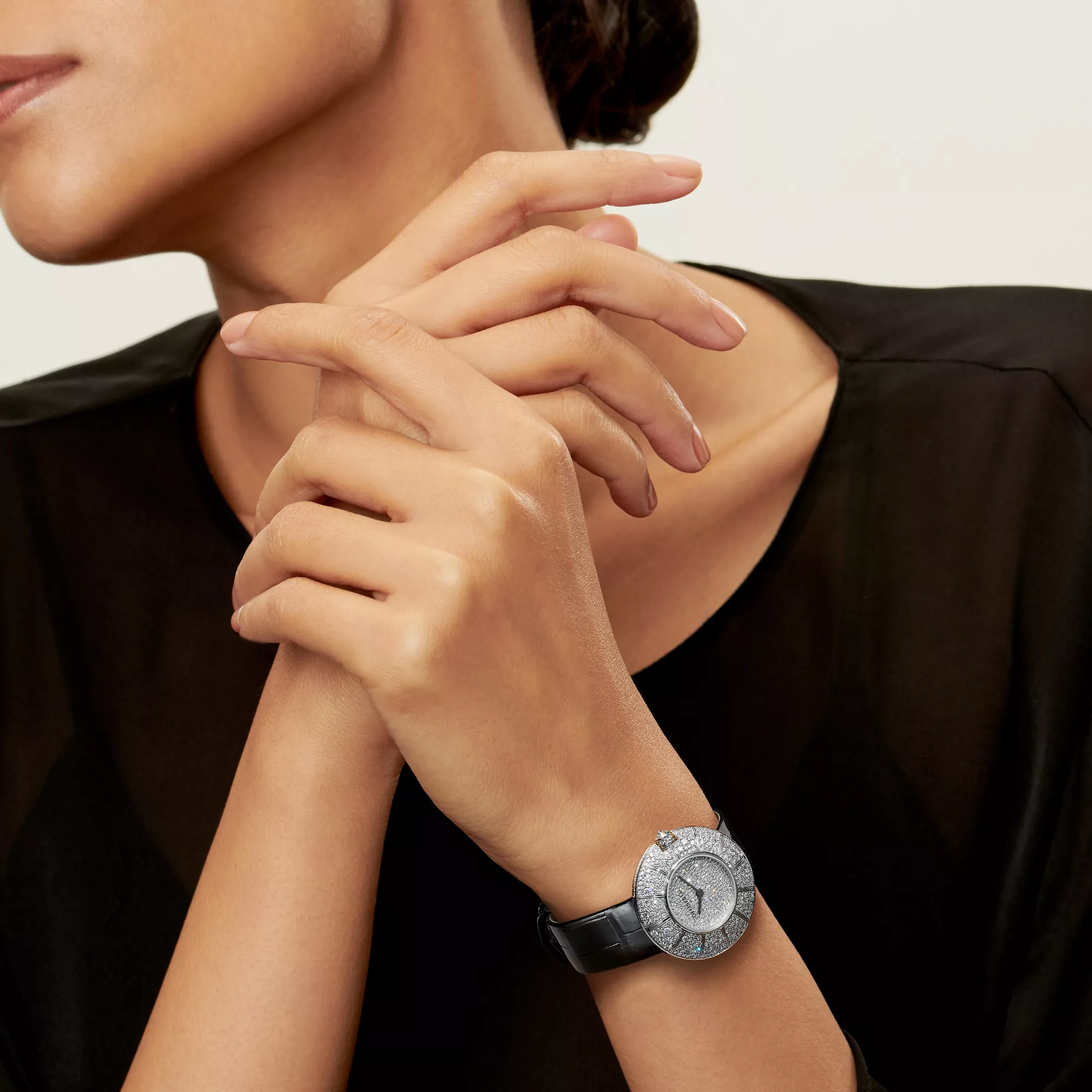 Tiffany 57 ist eine Hommage an New York und unser ikonisches Wahrzeichen an der 57th Street – dem Epizentrum des Luxus. Jede Tiffany 57 Uhr überzeugt mit ihren funkelnden Diamanten, die für maximalen Glanz in einer innovativen Serti-Neige-Fassung angeordnet sind. Die tief eingravierten Linien auf der Lünette spiegeln die unverwechselbare Art-déco-Ästhetik der Stadt wider. Das runde, kuppelförmige Gehäuse ist vom Zentrum des Washington Square Park und den Vintage-Taschenuhren aus dem Tiffany Archiv inspiriert. Handgefertigt in der Schweiz. Eine Ikone für die Ewigkeit an der 57. und Fifth Avenue.