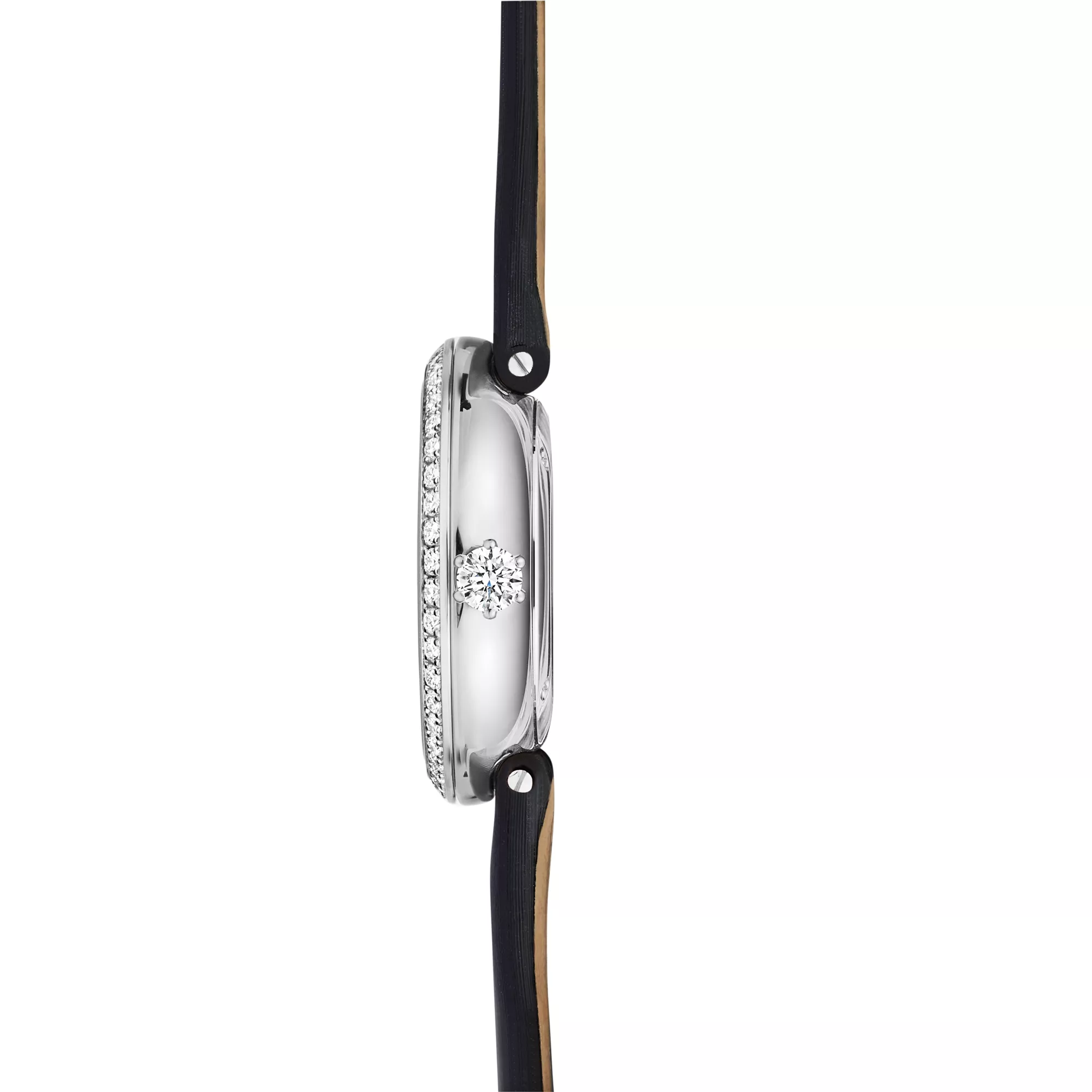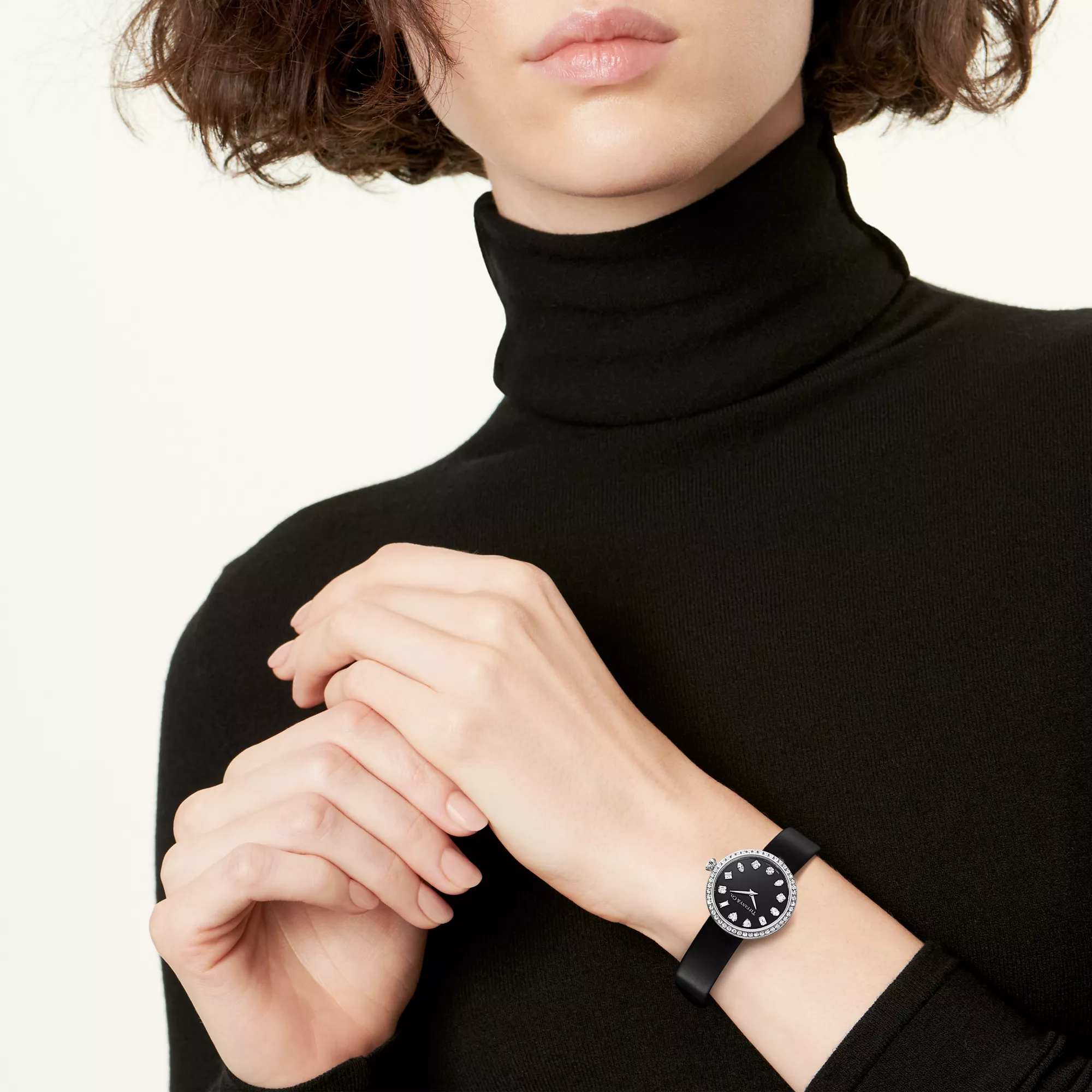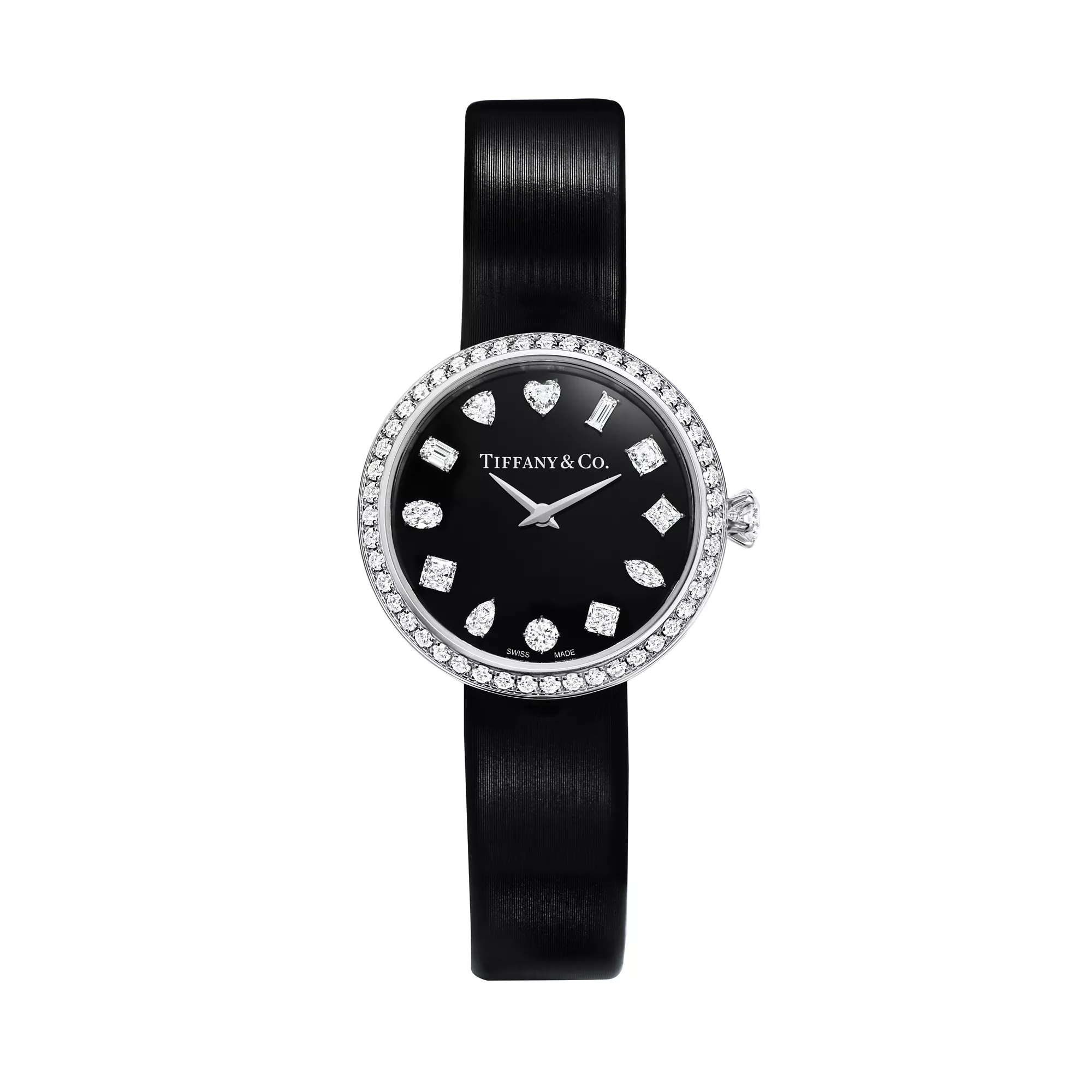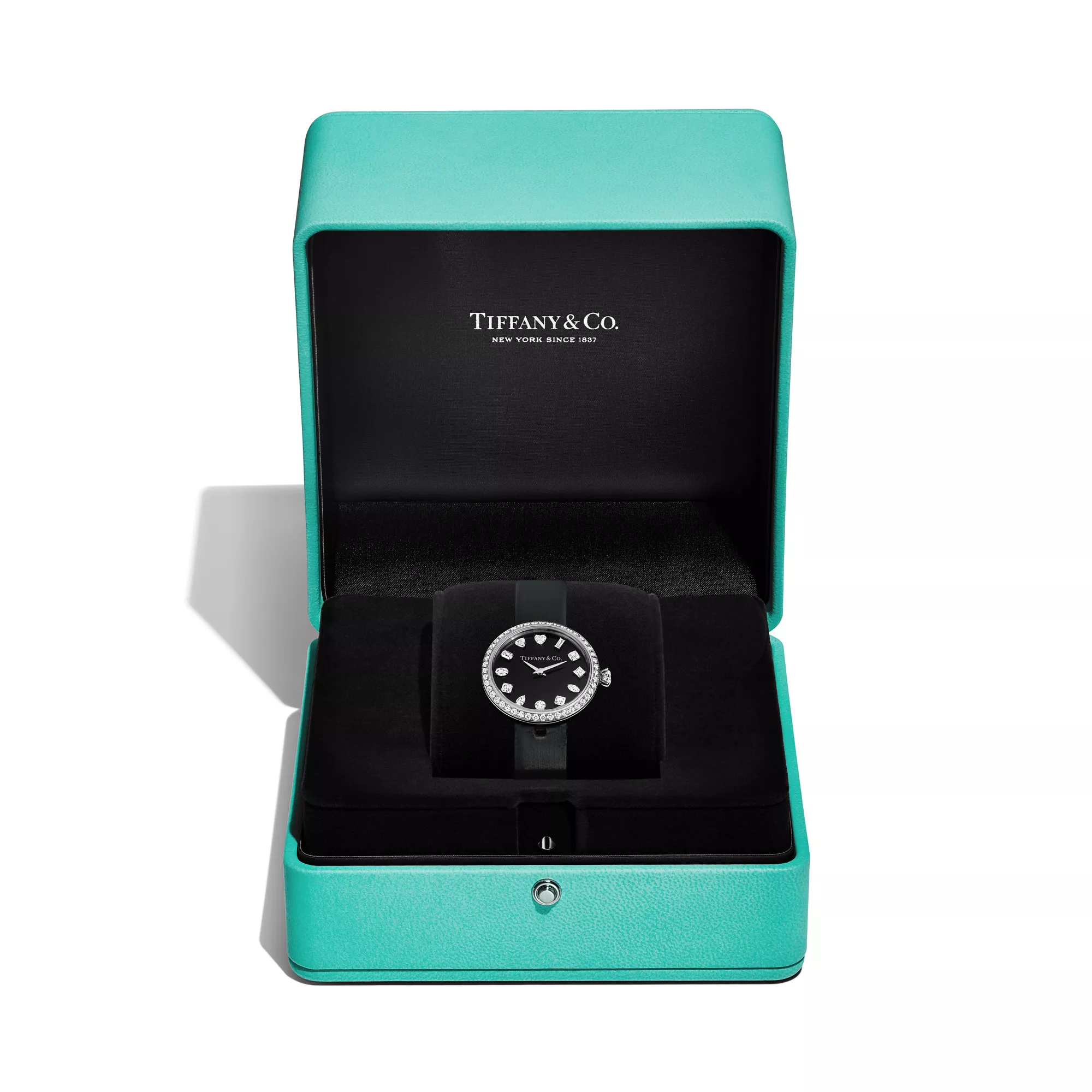 Tiffany Eternity Uhren erinnern uns daran, im Hier und Jetzt zu leben. Inspiriert von einer Serie alter Tiffany & Co. Werbungen aus den 1960er- und 70er-Jahren, zeigt das Zifferblatt verschiedene Diamantschliffe an jeder Stundenmarkierung: den runden Brillantschliff sowie Baguette, Cushion, Tiffany True®, Marquise, Asscher, Herz, Birne, Oval, Smaragd, Dreieck und Prinzess. Die Krone der Uhr ist vom Tiffany® Setting Verlobungsring inspiriert und greift dessen ikonische 6-fache Krappenfassung auf – eine wunderschöne Ergänzung zu dem Kranz aus Diamanten im runden Brillantschliff, der das Gehäuse umgibt. Diese Uhr in Weißgold mit schwarzem Kalbslederband und Diamanten im runden Brillantschliff auf der Schließe. Diese beeindruckende Darbietung echter Handwerkskunst ist eine Hommage an unsere Tradition, die besten Diamanten der Welt zu präsentieren – damals, heute und für immer.